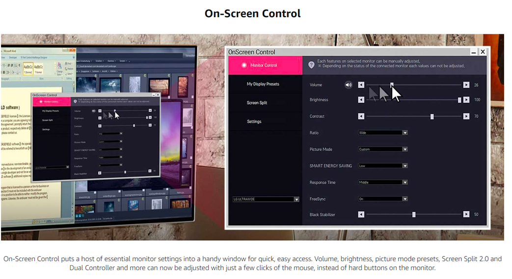 Large 34-Inch Full HD display gives you more screen space for work and for play, with wide viewing angles and highly accurate and vivid color. 3-side borderless screen features a slim bezel on three sides and no distractions from the dazzlingly precise, lifelike image while MaxxAudio completes your immersive experience. AMD FreeSync technology resolves the communication issues between processor and monitor, reducing screen tearing and choppiness. FreeSync is available when connected via HDMI or DisplayPort with a compatible video card. Game modes for FPS games and even an RTS preset mode allow you to choose the best conditions for your gameplay. Stay in the game as you take fast, easy control of essential monitor settings including picture, audio and Screen Split with just a few clicks of your mouse with On-Screen Control*. *Software download required to enable OnScreen Control. For download details, visit LGUSA.com/OnScreenControlSupport.