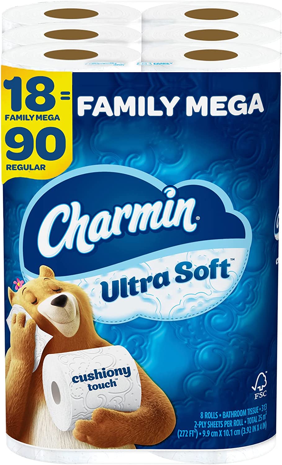 Charmin Ultra Soft Cushiony Touch Toilet Paper, 18 Family Mega Rolls = 90 Regular Rolls