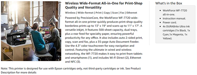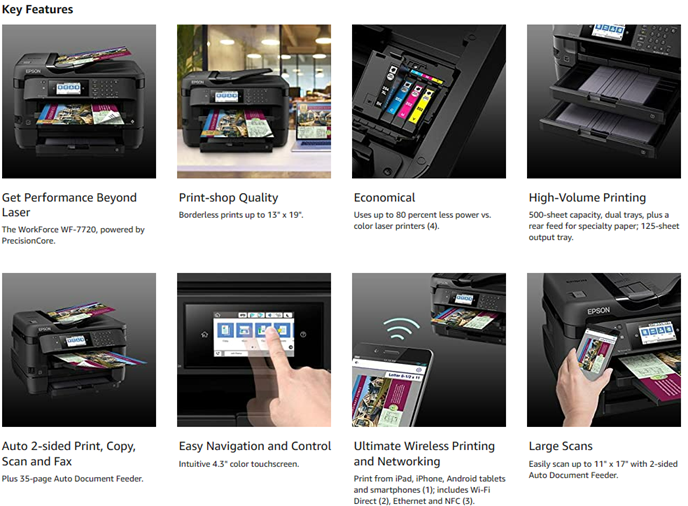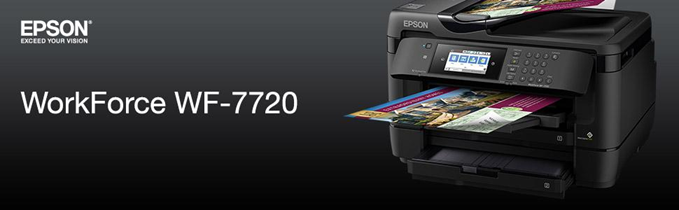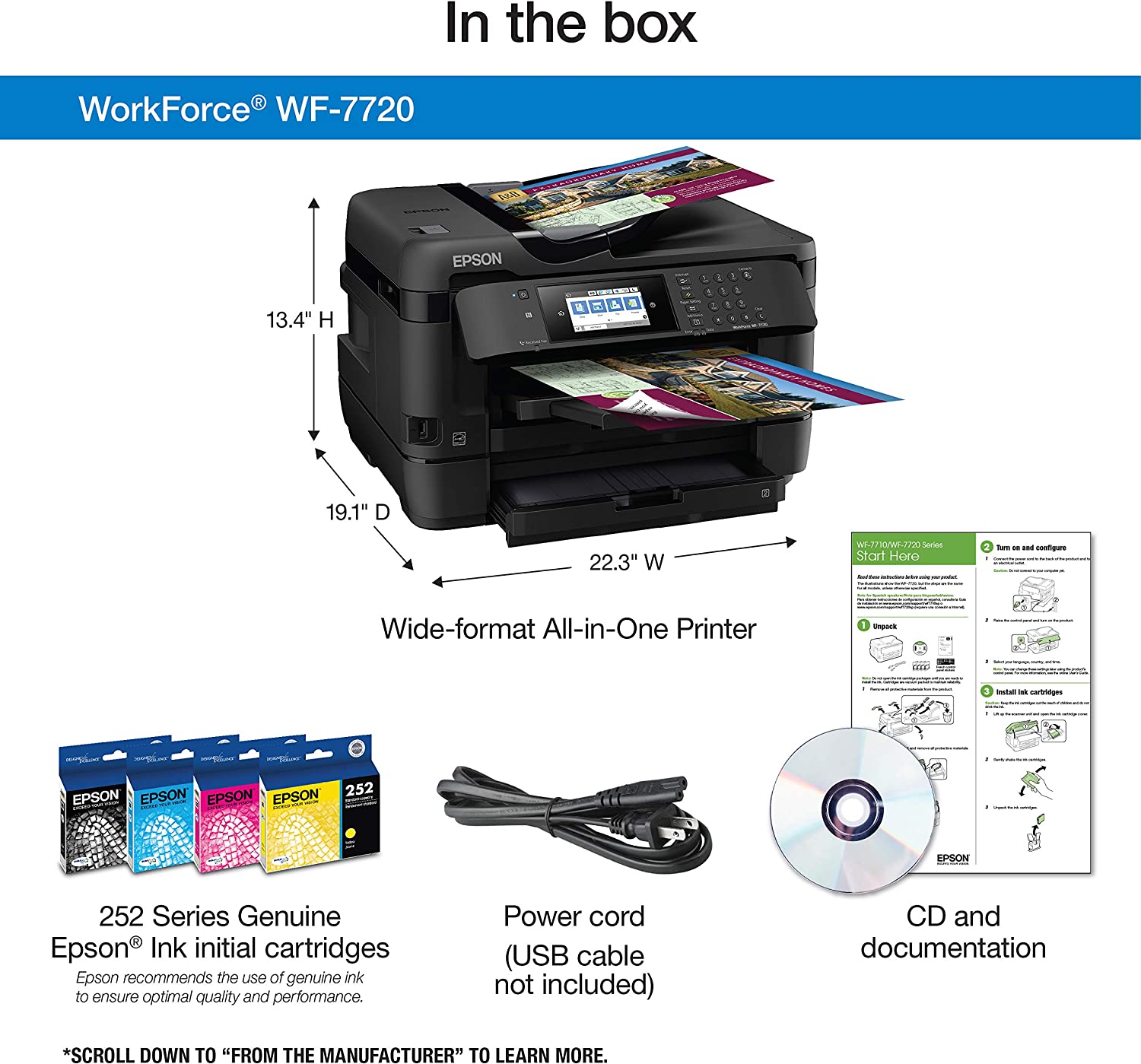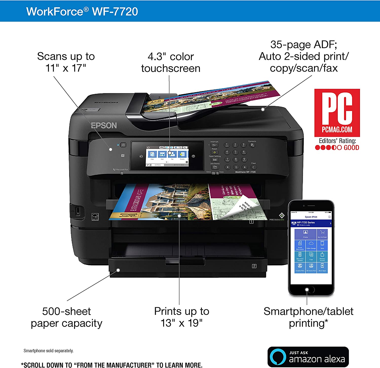 Powered by Precision Core, the workforce WF-7720 wide-format all-in-one printer quickly produces print-shop-quality borderless prints up to 13" X 19" And scans up to 11" X 17". A versatile inkjet, it features 500-sheet capacity, dual trays, Plus a rear feed for specialty paper, ensuring powerful productivity for any office. It also includes auto 2-sided Print, copy, scan and fax, Plus a 35-page auto document feeder. Use the 4. 3" Color touchscreen for easy navigation and control. Featuring the ultimate in wired and wireless networking, the WF-7720 makes it easy to print from tablets and smartphones), and includes Wi-Fi direct(2), Ethernet and NFC). This Epson printer is designed for use with only genuine Epson-brand cartridges. Other brands of ink cartridges and ink supplies are not compatible and, even if described as Compatible, may not function properly or at all. Epson provides information about the design of the printer on the box and in many other locations and materials Included with the printer and on the website. Epson periodically provides firmware updates to address issues of security, performance, minor bug fixes and ensure the printer functions as designed. This printer was designed to work only with genuine Epson ink cartridges and some updates may affect the functionality of third party ink. Non-Epson branded or Altered Epson cartridges that functioned prior to a firmware update may not continue to function. Black and color print speeds are measured in accordance with ISO/IEC 24734. Actual print times will vary based on system configuration, software, and page complexity. For more information, visit www. Epsonbination/printspeed1 most features require an Internet connection to the printer, as well as an Internet- and/or email-enabled device. For a list of Epson Connect enabled printers and compatible devices and apps, visit www. Epsonbination/connect2 Wi-Fi certified; level of performance subject to the range of the router being used. Wi-Fi Direct may require printer software. 3 NFC requires use of a device that includes NFC, and may require additional software. 4 Up to 80 percent based on comparing manufacturers’ reported Tec values of the best-selling, A3 color laser printers priced at $999 (USD) or less with print Speeds of 30 ppm or less as of December 2016. Actual power savings will vary by product Model and usage. 5 see our website for convenient and reasonable recycling options at www. Epsonbination/recycle6 smart way is an innovative partnership of the U. S. Environmental Protection Agency that reduces greenhouse gases and other air pollutants and improves fuel efficiency.