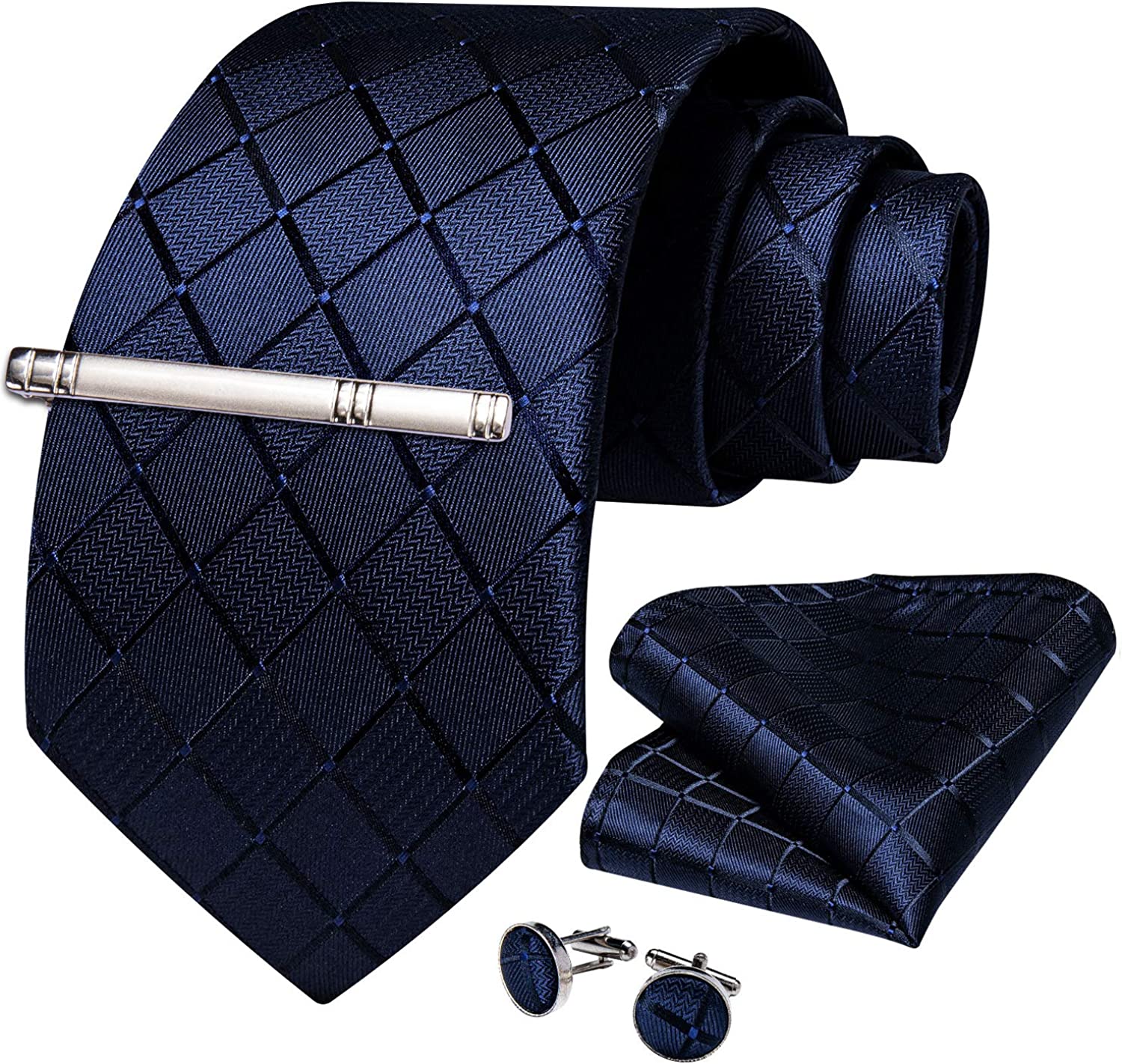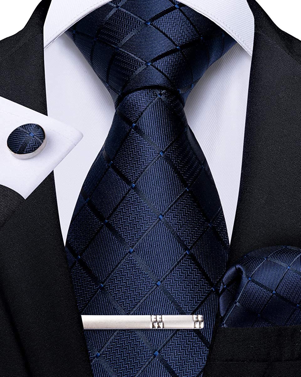 • ?【PURCHASE CONTAINS】Silk Navy Blue Plaid Necktie + Woven Pocket Square + Cufflinks + Silver Tie Clip+ Gift box.It's Proper gift for Father's Day,Christmas Day,Valentine's Day,Thanksgiving Day,Anniversary,birthday ect.