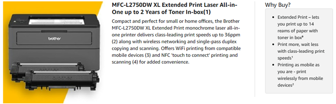 The Brother Compact Laser All-in-One comes with a two-year limited warranty and free at-your-side support, online or by call or live chat, for the life of your printer. At Brother, we want to ensure that your experience with us is exceptional. If your home or small office is looking for an efficient and user-friendly all-in-one, add the Brother MFC-L2750DW to your Amazon shopping cart today.