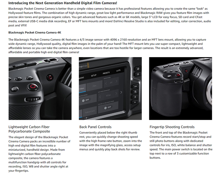 Blackmagic Pocket Cinema Camera has the professional features needed for feature film, television programming and documentaries, however now these same features can be used to revolutionize other types of work such as blog videos, YouTube content and more. You get the same features found on expensive digital film cameras, allowing capture of deeper colors, higher image detail and a wider dynamic range between the brightest highlights and deepest shadows. It's the key reason why feature films look so amazing and now you can get these same high end production values for any kind of work. Imagine getting film quality on independent film, music videos, weddings, corporate videos, documentaries and more!