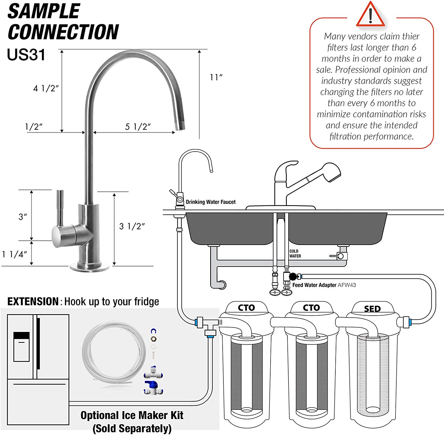 - [Easy to Install and Maintain]: This system is designed for easy installation, low maintenance, and features dual carbon block filters along with a high-capacity sediment filter. The sediment filter protects and extends the life of your system, while the carbon block filters work to remove many harmful contaminants a. You can replace the filter every 6 to 12 months, judged by the water’s taste.