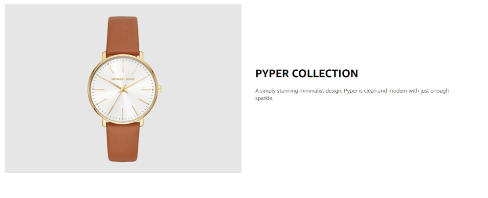 Watch Sizing Guide Find a confident ensemble with the addition of this sleek Michael Kors® Pyper watch. Stainless steel case. Leather strap with adjustable buckle closure. Round face. Three-hand analog display with quartz movement. Dial features gold-tone hands and hour markers, minute track, and Michael Kors detailing. Water resistant 165 feet. Display case included. Imported. Measurements: Case Height: 38 mm Case Width: 38 mm Case Depth: 7 3⁄10 mm Band Width: 17 mm Band Circumference/Length: 8 3⁄4 in Weight: 1.2 oz