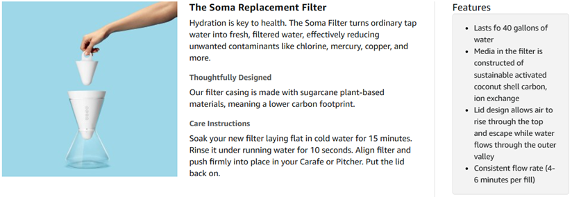 Soma is on a mission to improve life for everyone who drinks water, with sustainable, plant-based filters that make water healthy and delicious, beautiful carafes and pitchers, and the convenient Filters by Mail service or on Amazon.The Soma filters come in a pack of 2. Each Soma filter features coconut shell carbon and a plant-based casing so you can feel good about your water. Each filter is effective for 40 gallons, or about two months.
