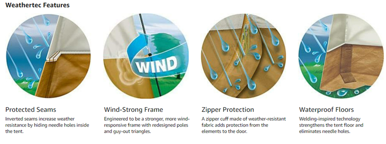 • Weatherproof: Welded corners and inverted seams keep water from getting in; Included rainfly offers extra weather protection.Roomy interior: 10 x 9 feet with 5 feet 11 inch center height; Fits 2 queen-size air beds 1-year limited warranty. Shelter Center Height : 68 in