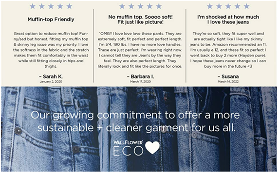 • ECO LOVE: WallFlower’s growing commitment to offer a more sustainable products & cleaner garments for all of us. We are on a journey to craft garments that are more mindful by using cleaner processes, recycled paper tags and more eco materials.