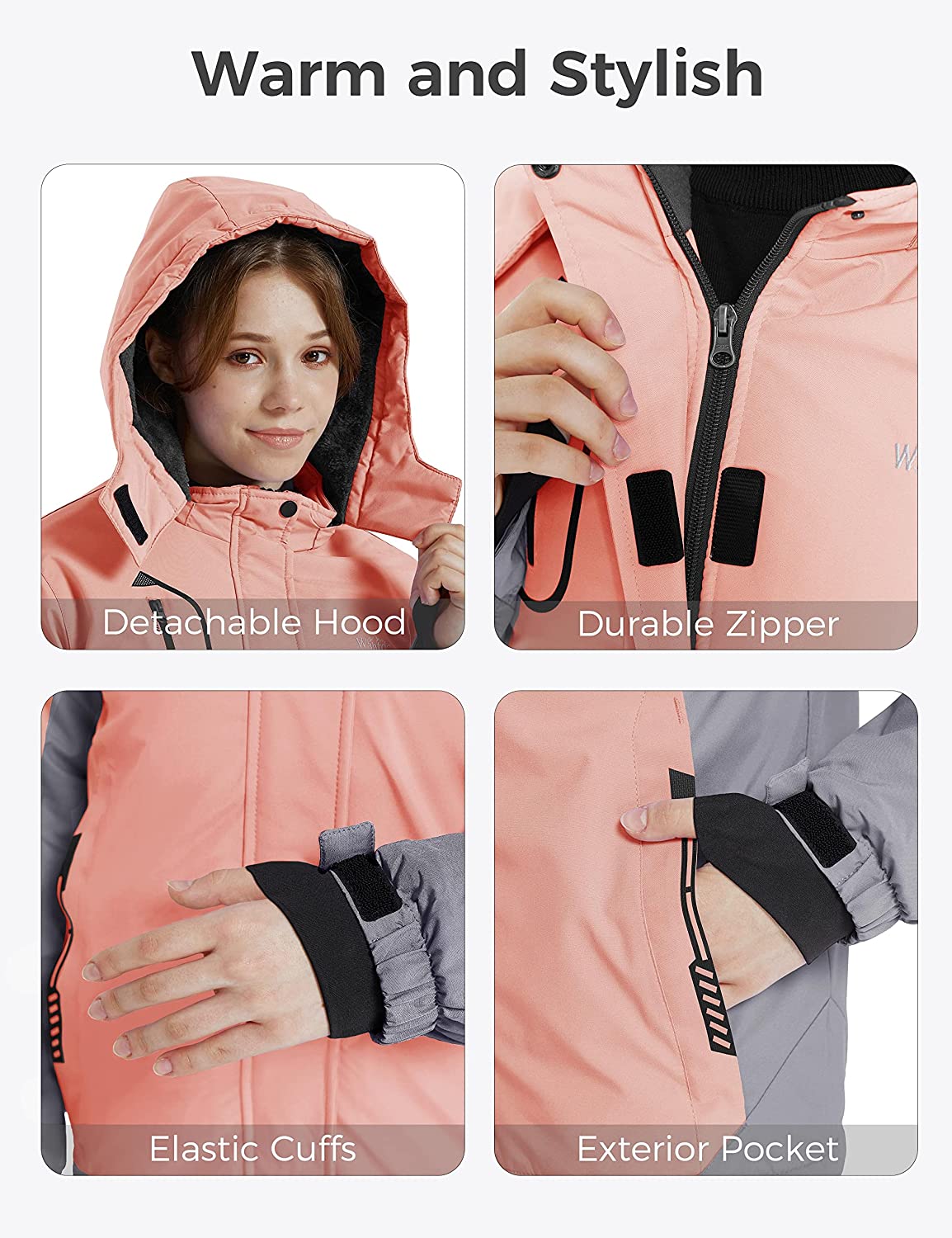Keep The Cold & Snow Out - This fleece-lined snowboarding for girls is the ideal choice for keeping your kids warm and protected from harsh winds and snow. The hooded fleece ski jacket for girls features adjustable cuffs with thumbhole, detachable fleeced hood and wide collar, all designed to keep cold air and snow out and warmth in.