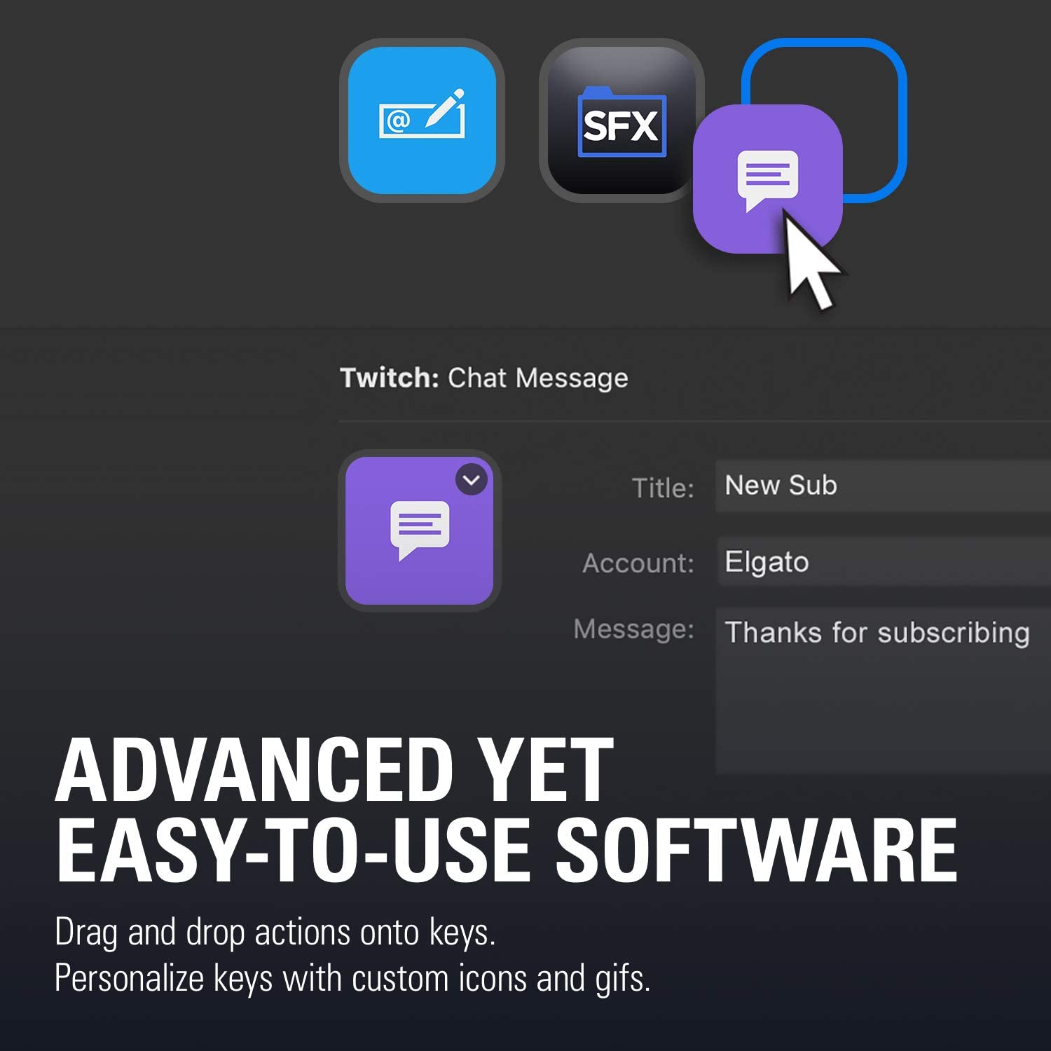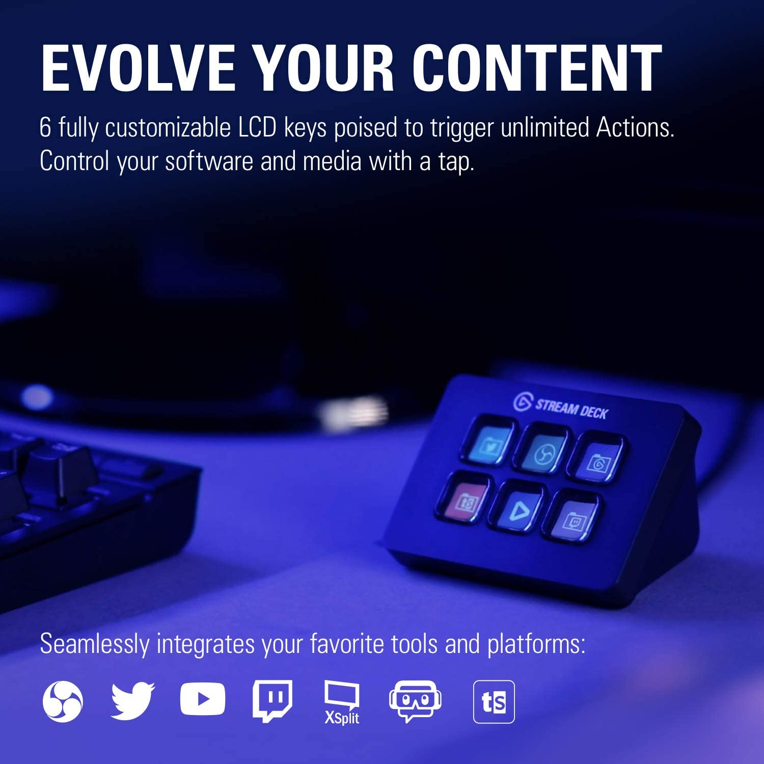 Powerful Integrations: Elgato 4KCU, OBS, Twitch, YouTube, Twitter, Discord, Spotify, Philips Hue, vMix, VoiceMod, and more.