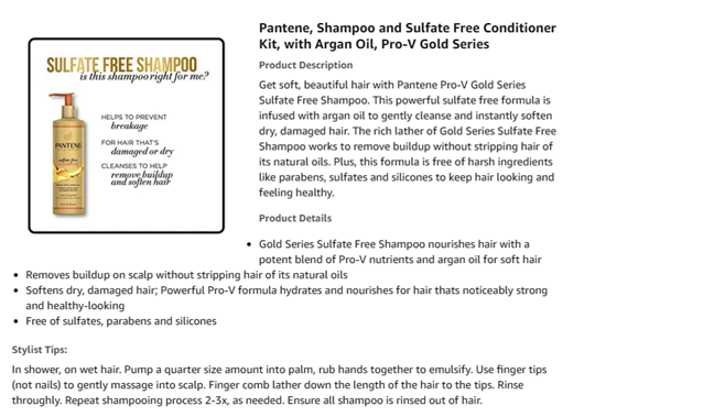 Get soft, beautiful hair with Gold Series from Pantene Sulfate Free Shampoo and Moisture Boost Conditioner. The powerful sulfate free shampoo is infused with argan oil to gently cleanse and instantly soften dry, damaged hair. The rich lather of Gold Series from Pantene Sulfate Free Shampoo works to remove buildup without stripping hair of its natural oils. Plus, this formula is free of harsh ingredients like parabens, sulfates and silicones to keep hair looking and feeling healthy. The Gold Series from Pantene Moisture Boost Conditioner moisturizes and detangles hair for instant softness and strength* after just one wash. Our hydrating conditioner is infused with Argan Oil, which absorbs into the hair to provide immediate relief and radiant shine. This paraben-free, dye-free, sulfate-free Argan Oil conditioner will give your hair resilience and flexibility after the first wash.