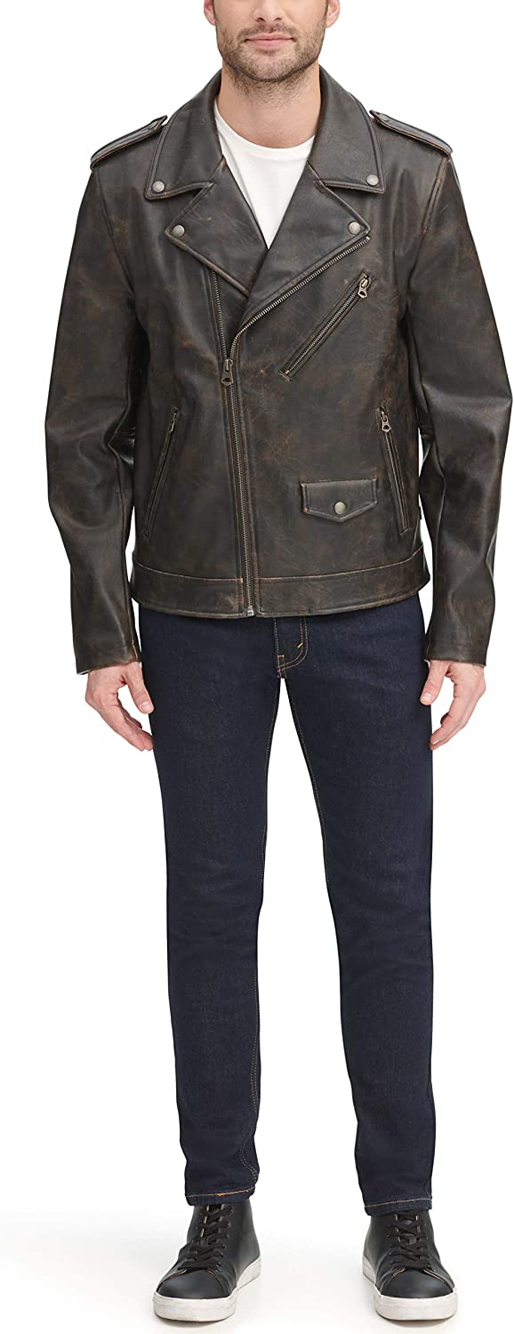 Classic faux leather motorcycle jacket with buffalo plaid lining, zipper front closure, epaulettes on shoulders, zipper detailed cuffs, Levi's red tab on left chest pocket. One chest welt zipper pocket, two lower welt zipper pockets, and one small coin pocket with snap. closure and one interior welt pocket with snap closure.