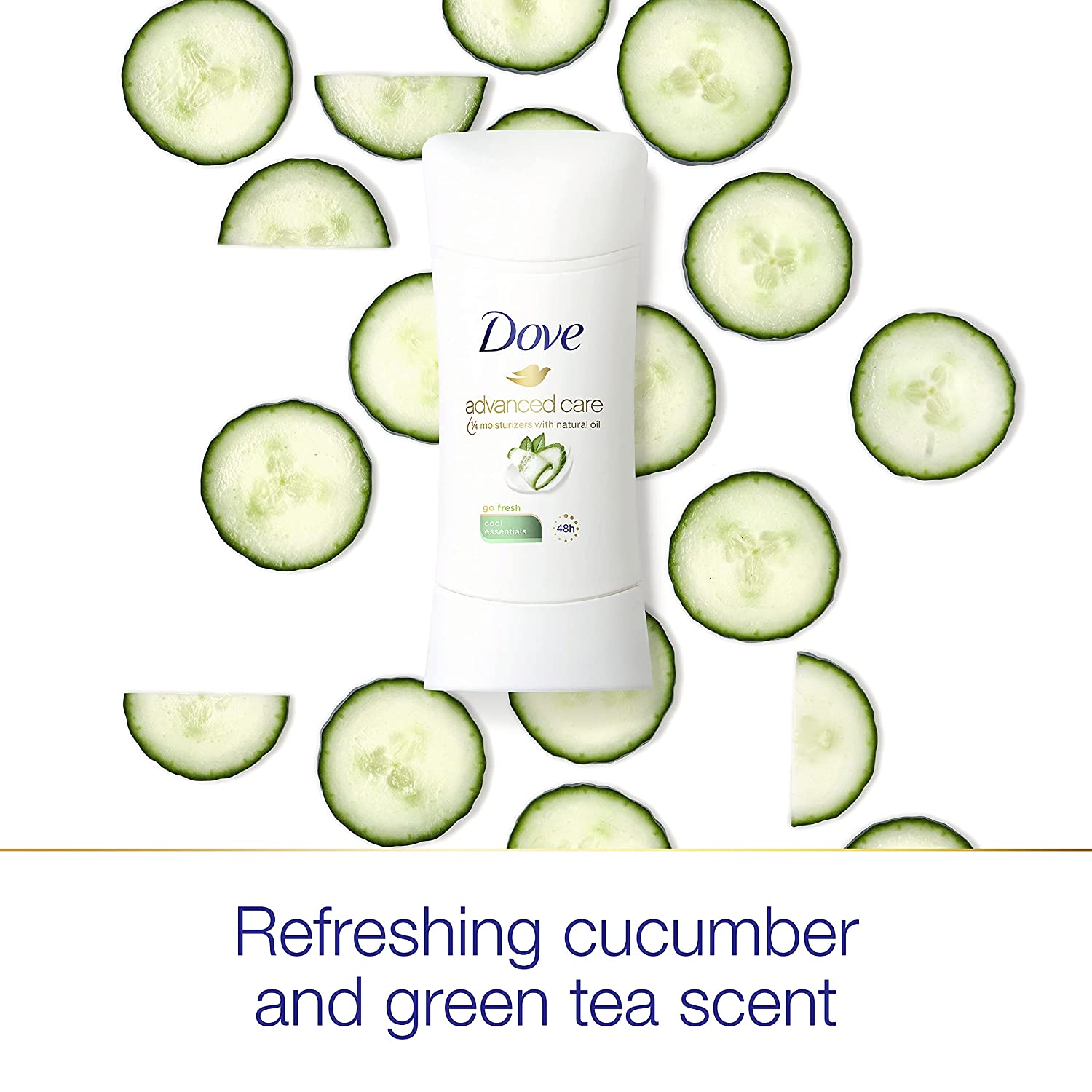 Infused with the fresh fragrance of crisp cucumber and honeydew melon blended with green tea, Dove Advanced Care Cool Essentials Antiperspirant Deodorant Stick is perfect if you’re looking for a long lasting, invigorating, and fresh scent. It's also a great choice if you're looking for a deodorant for sensitive skin. With an alcohol free formula that’s kind to skin, this deodorant helps to relieve the irritation that shaving can cause. Dove antiperspirant deodorant, enriched with our signature 1/4 moisturizers with natural oil, cares for your delicate underarm skin – leaving your underarms feeling healthy and protected. As much as it cares for your skin, this deodorant for women doesn’t compromise on effective antiperspirant protection. Keeping you fresh, this gentle deodorant protects from sweat and odor for up to 48 hours. For best results, apply this Dove antiperspirant deodorant to dry skin after showering and enjoy fresh, comfortably dry skin from morning to night. Dove is Certified Cruelty Free by PETA because we believe that real beauty is cruelty free. We’re on a mission to help women raise their selfesteem because we believe beauty should be a source of confidence, not anxiety. Dove Antiperspirant Deodorants deliver effective underarm protection and are kind to skin, so women can be free of underarm inhibitions and live beautifully unselfconsciously.