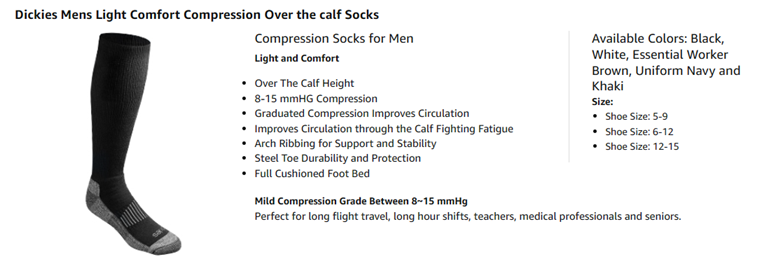 Dickies light weight comfort compression socks for men circulation is engineered with gentle mild compression throughout the leg to improve circulation and fight leg fatigue. Compression socks are not too tight or hard to get it on and fit well, these socks are mild compression grade between 8~15mmHg.