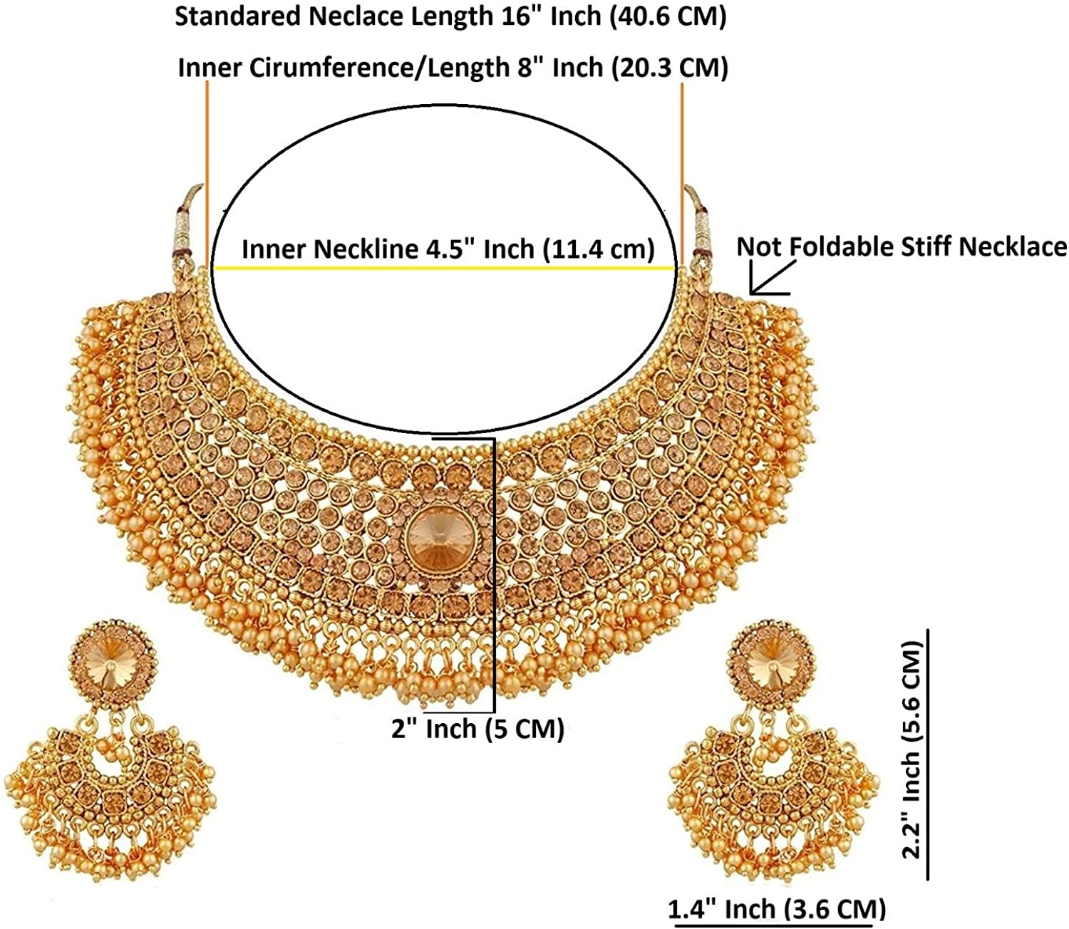 Content: 1) Inner Circumference/ Length: 8" Inch (20.3 cm), Necklace L x W: 16" Inch x 2" Inch (40.6 cm x 5 cm), with an adjustable soft tassel closure and it fits to neckline size 4.5" Inch (11.4 cm), 2) A pair of Dangle Earrings L x W: 2.2" Inch x 1.4" Inch (5.6 cm x 3.6 cm), 3) Maang tikka L x W: 5.6" Inch x 1.1" Inch (14.2 cm x 2.8 cm)