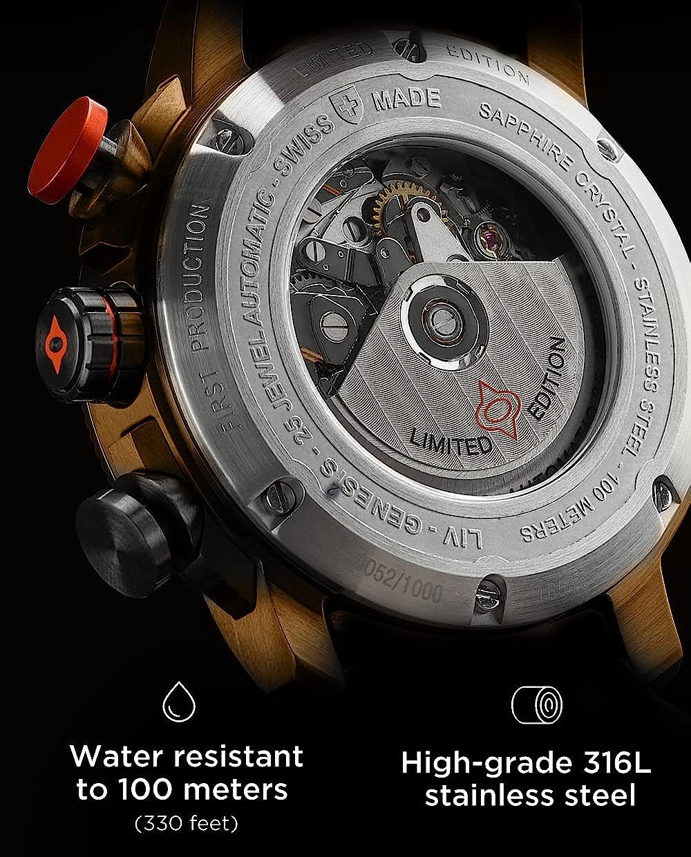 SWISS CRAFTMANSHIP: The GX-AC Swiss Automatic Chrono is handcrafted in Switzerland and undergo intense testing in the land of the alps.