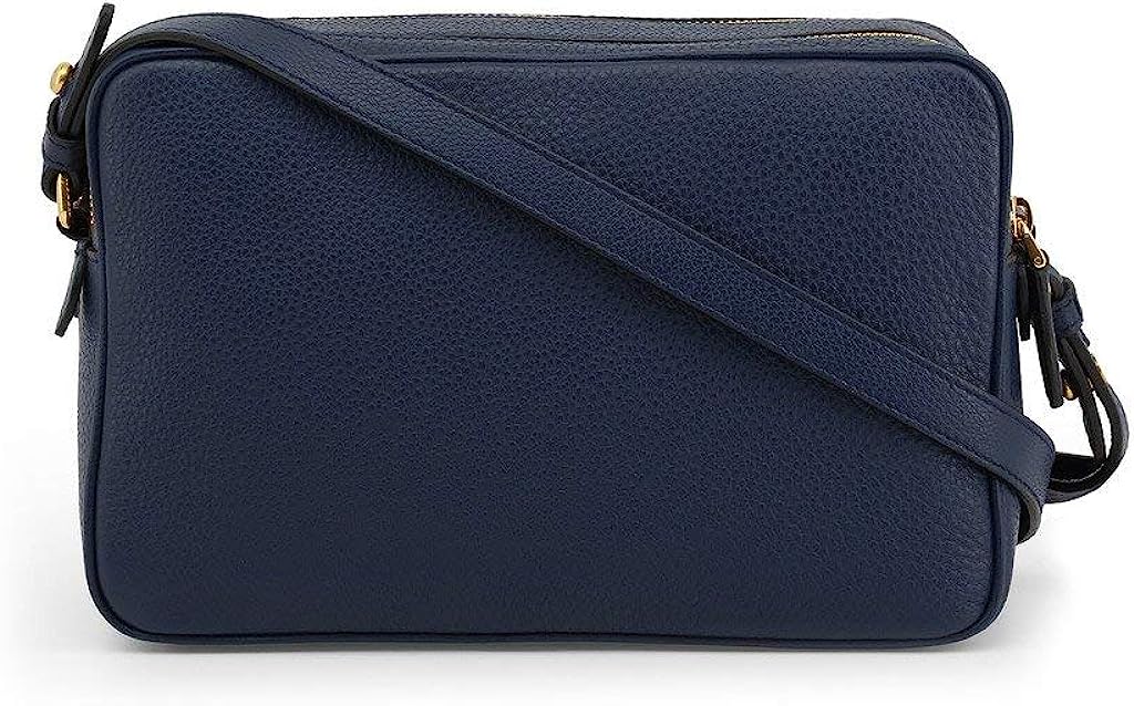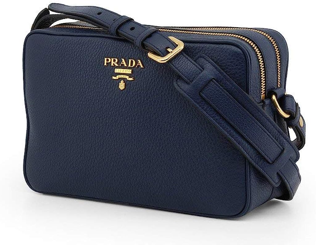 • This crossbody bag is crafted with navy blue vitello phenix pebbled leather. The bag features a gold Prada Milano logo on the front and an adjustable leather strap. The two zipper compartments open to a spacious jacquard lined interior that allows for convenient storage and organization.