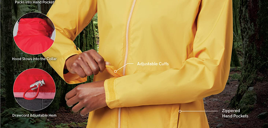 • HANDY FEATURES: Completely waterproof, adjustable cuffs, drawcord adjustable hem, two zippered hand pockets, and the whole jacket packs down into its own pocket for easy toting.