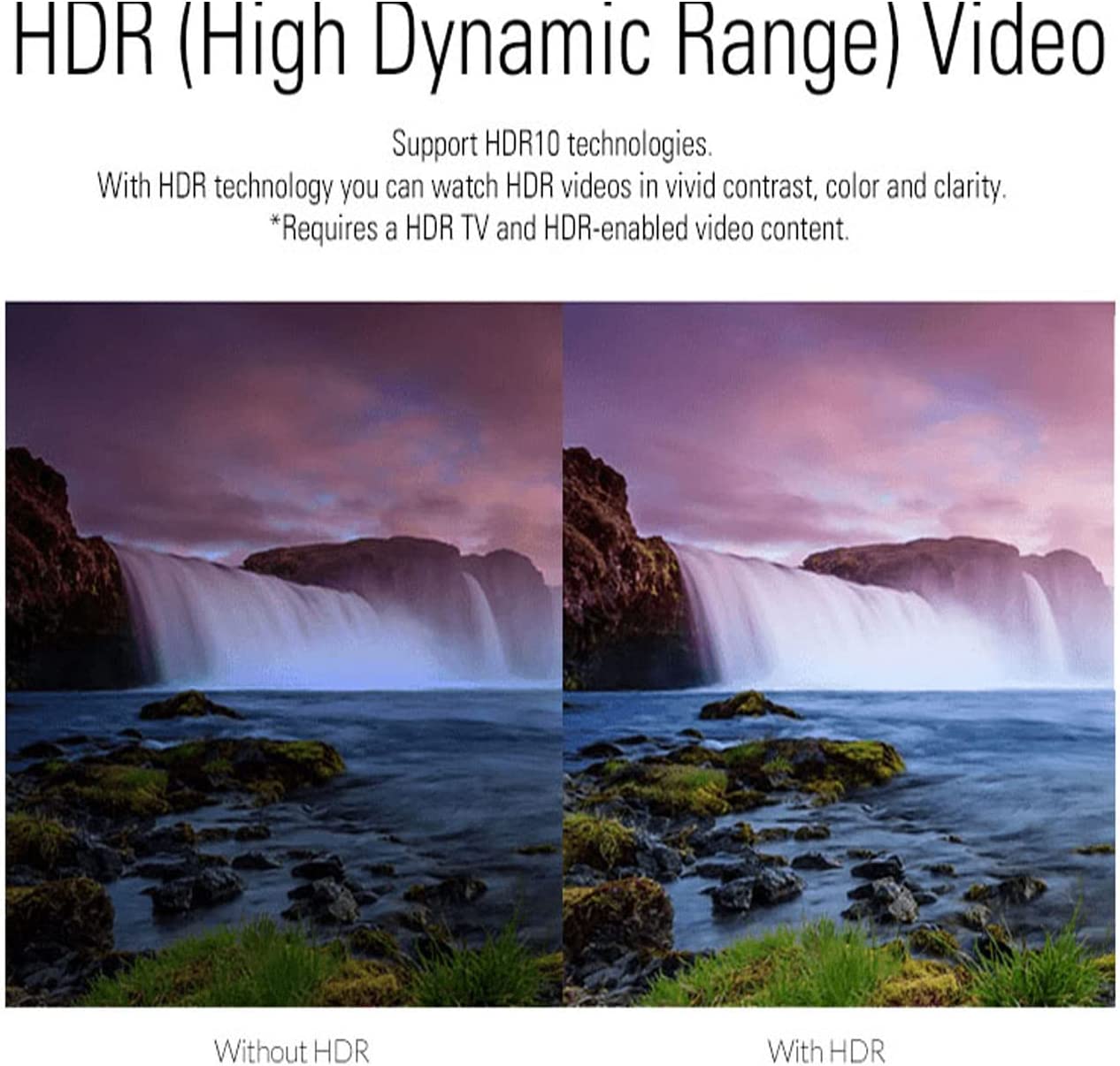 • Support HDR10 ,support all major video format, with HDR technology you can watch HDR videos in vivid contrast, color and clarity(requires a HDR TV and HDR-enabled video content)