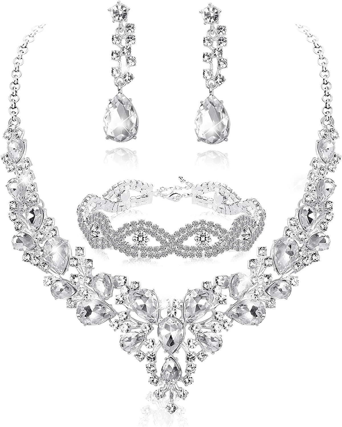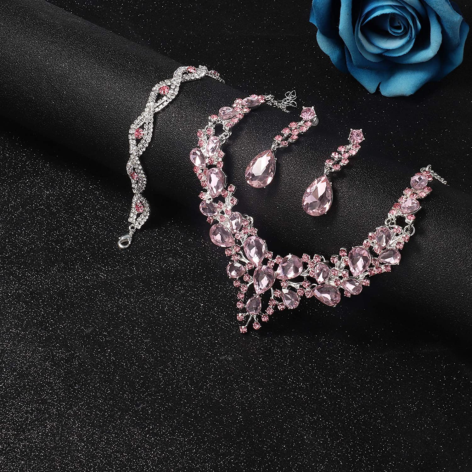 RHINESTONE JEWELRY SIZE-- Crystal Necklace Adjustable Chain Length 39cm (15.35’’)- 45cm (17.72’’), Bridal Drop Earrings Length: 5cm(2’’). Teardrop Bracelet Length: 19.5cm(7.7’’), With 7cm (2.8’’) Extension Chain, Easy To Adjust, No Worry About Size Problem.