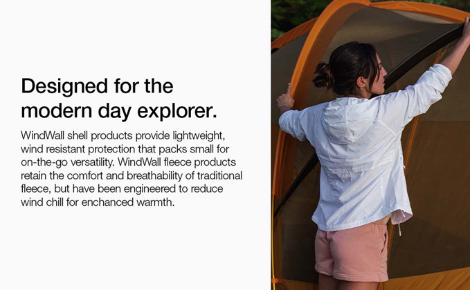Material: [front body] WindWall (150D polyester), DWR coating, [back body, side panels] 150D polyester fleece