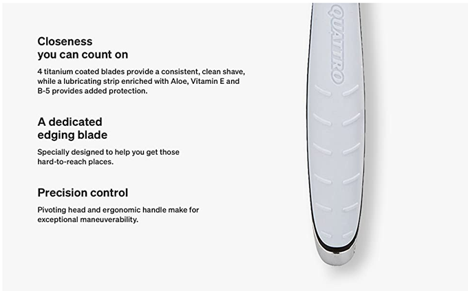 We all have that friend we can rely on through thick and thin. The Schick Quattro Razor is that friend. It’s always there for you in times of stubble, providing a consistent, clean shave with its 4 titanium-coated blades. You won’t find a better shave for a better price. The Schick Quattro for men is a titanium razor that features an edging blade, pivoting head, ergonomic handle, and a lubricating strip for a truly exceptional shave.