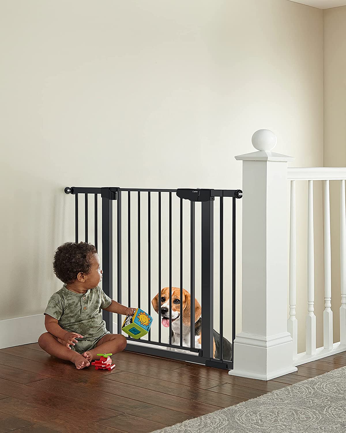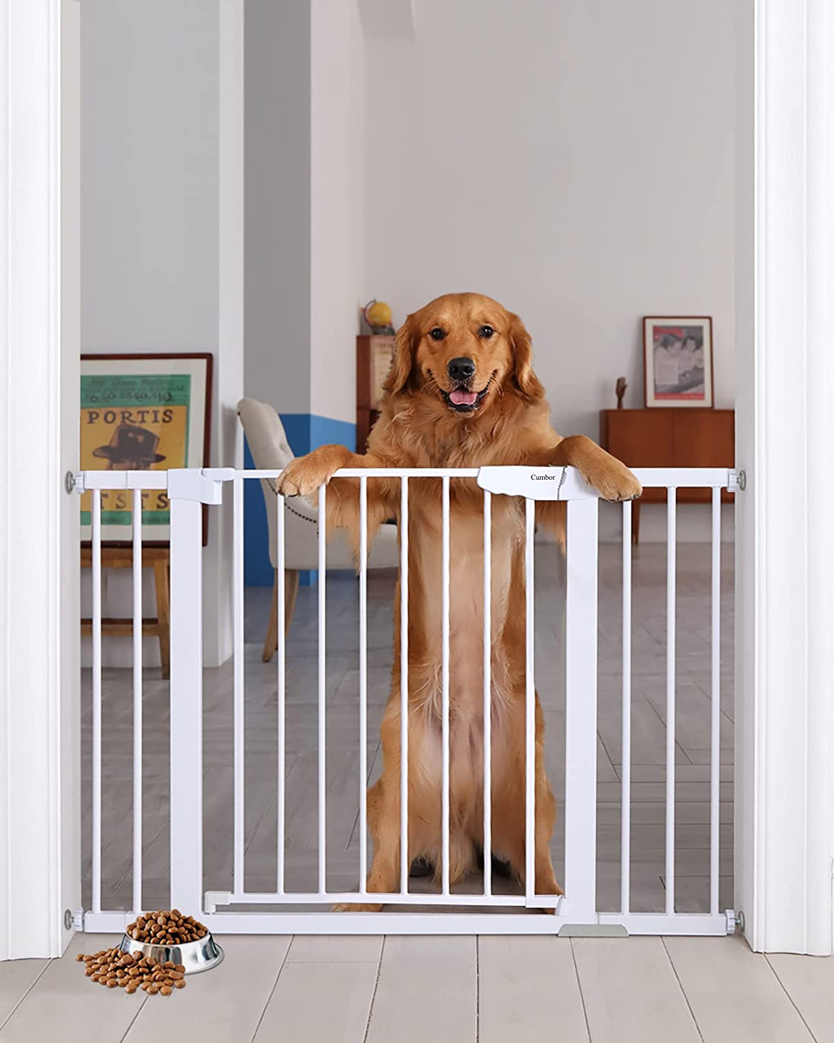 Mom's Choice Awards Winner-Cumbor 29.5-46" Auto Close Baby Gate for Stairs, Easy Install Pressure/Hardware Mounted Dog Gates for The House Indoor, Easy Walk Thru Wide Safety Pet Gates for Dogs, White