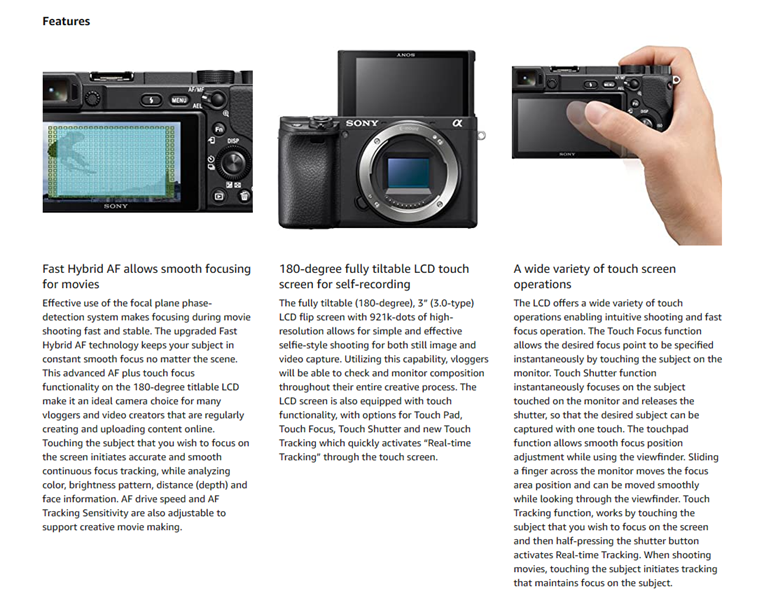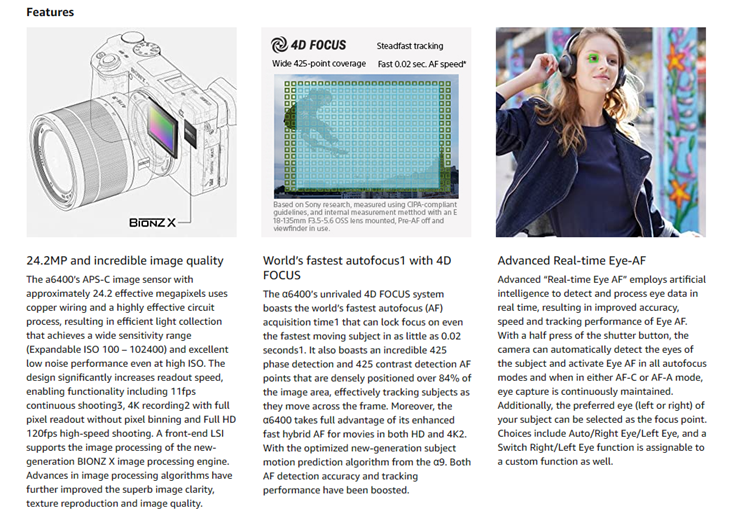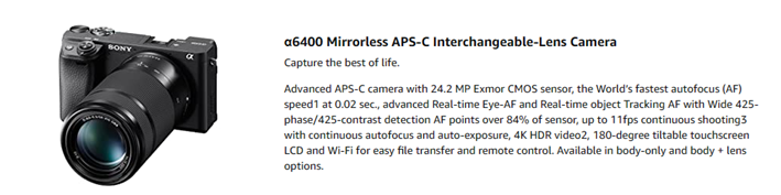 a6400 Mirrorless Interchangeable-Lens Camera with 18-135mm Lens (Black). Sensor Type: APS-C type (23.5 x 15.6 mm), Exmor CMOS sensor