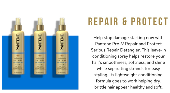 Spray some repair into your hair care. Help stop damage with Pantene Pro-V Nutrient Boost Repair & Protect Detangler. This leave-in conditioning mist treatment separates hair strands for easy styling, and it helps restore your hair to be soft and smooth with a healthy-looking shine. Enriched with antioxidants to reduce protein loss, Repair & Protect Detangler helps hair stay stronger against damage. The lightweight formula helps transform hair from dry and brittle to healthy and soft for a #greathairday. vs. non-conditioning shampoo.