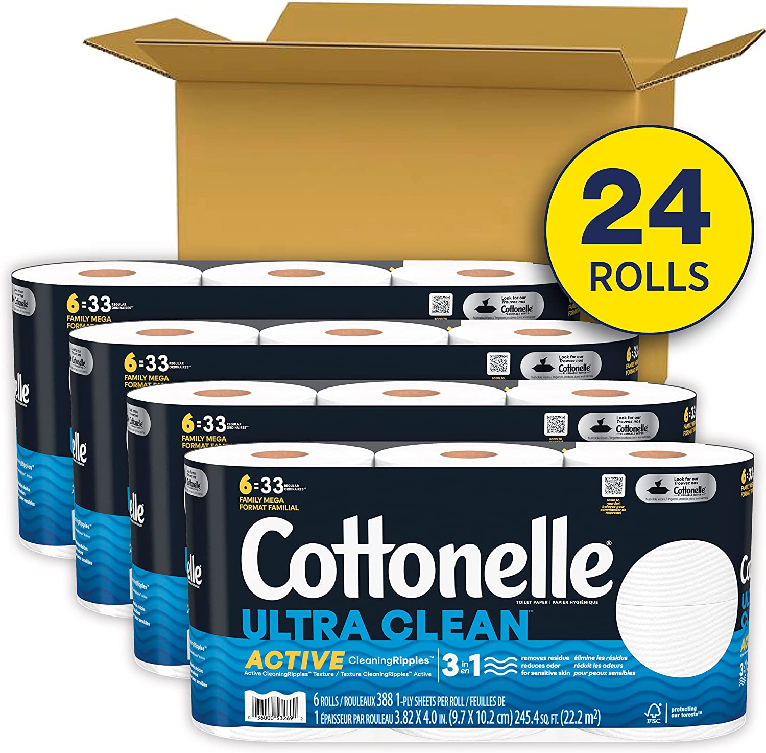 24 FAMILY MEGA ROLLS: Cottonelle Ultra Clean Toilet Paper with Active CleaningRipples Texture, 24 Family Mega Rolls (4 packs of 6); 388 sheets per roll.
