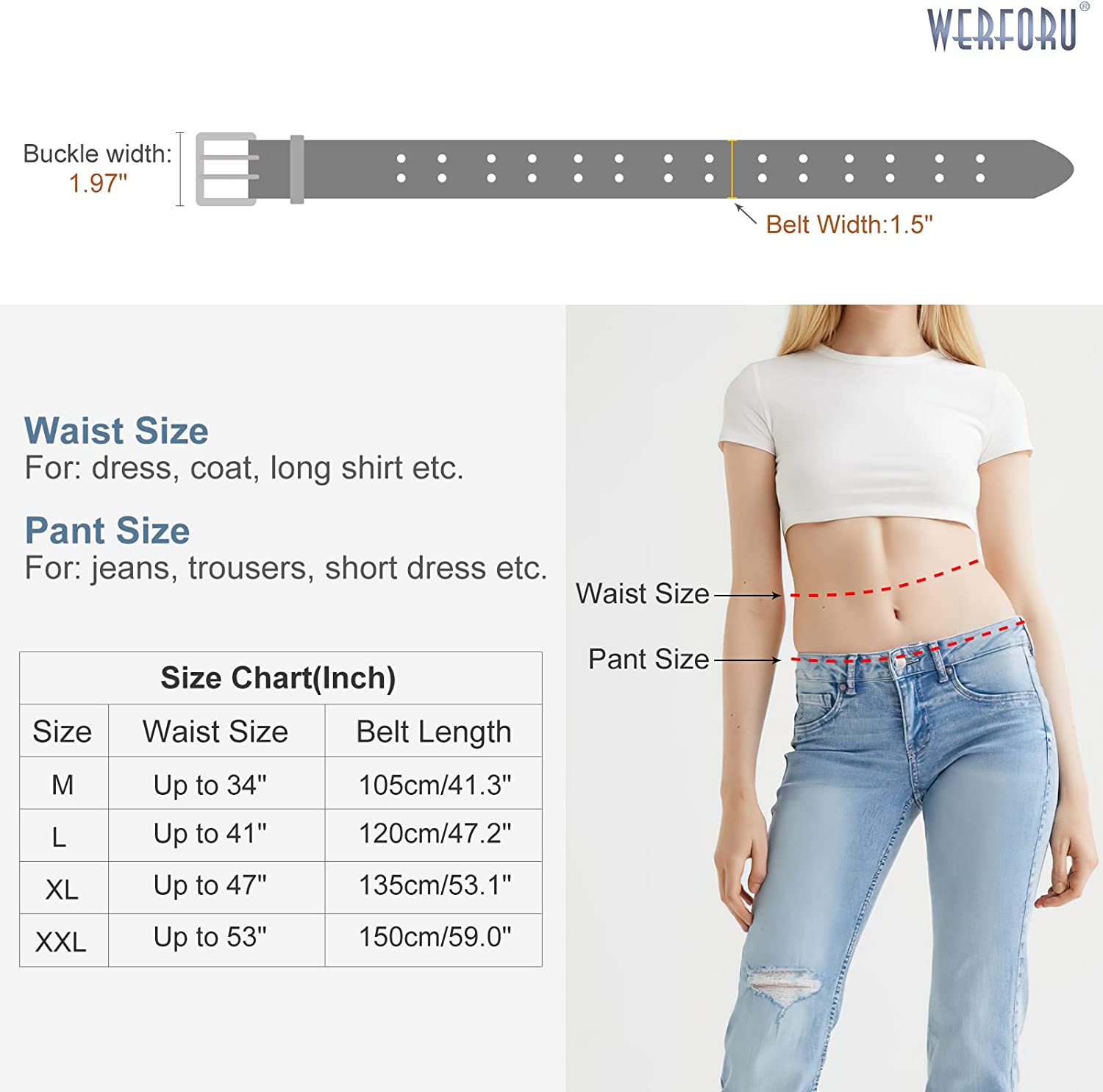 ?Size for Leather Belt: Double grommets cover the whole strap is quite adjustable for different waist sizes. M fit waist size below 34".L fit waist size below 41".XL fit waist size below 47".2XL fit waist size below 53". This lady belt covered with holes is 1.5" wide that fit most pant loop. Because the grommets go all the way around the belt, you can continue to wear the belt even if you lose/gain weight.