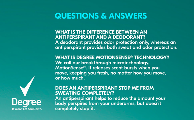 - GO BEYOND YOUR LIMITS: At Degree, we want to inspire the confidence in everyone to move more and go further. We’re here to support your journey through an antiperspirant for men that moves with you