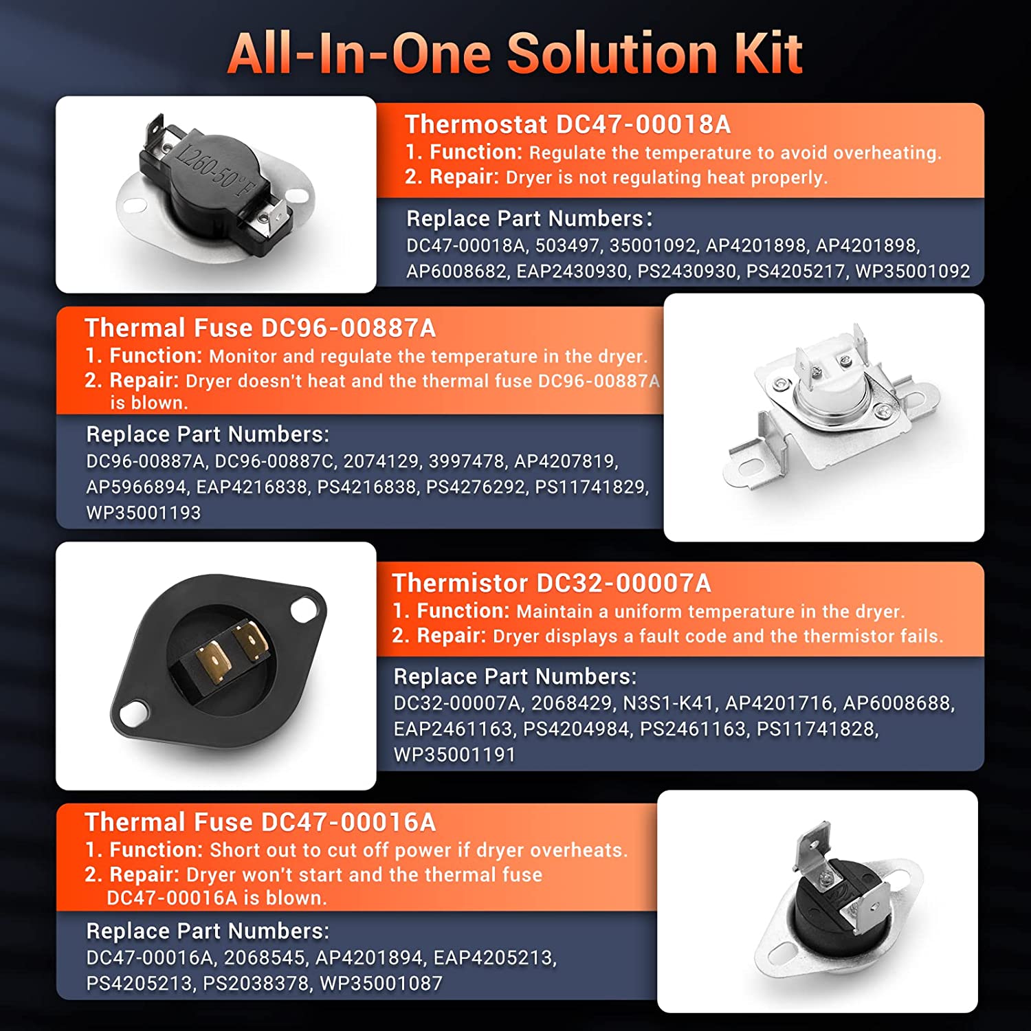 - Dryer Solution Kit: Azdele samsung dryer parts fix all the heating problems. Thermal fuse DC96-00887A & DC47-00016A repair dryer won't start. The thermostat regulates the temperature to avoid overheating. Thermistor monitors and maintains the temperature.