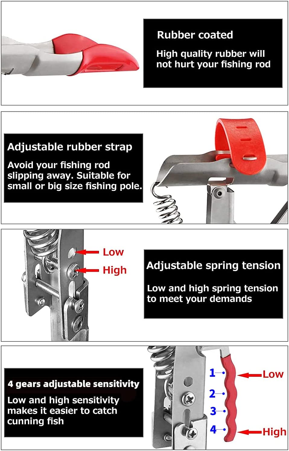 - 【Super Automatic Design】Fishing pole stand with single spring loaded tip-up action sets your hook automatically. Line trigger activates tip-up only when fish hits the hook - no misfires. Super sensitive and 4 levels sensitivity adjustable, Low and High Spring Tension adjustable, help you catch small or big fish easily