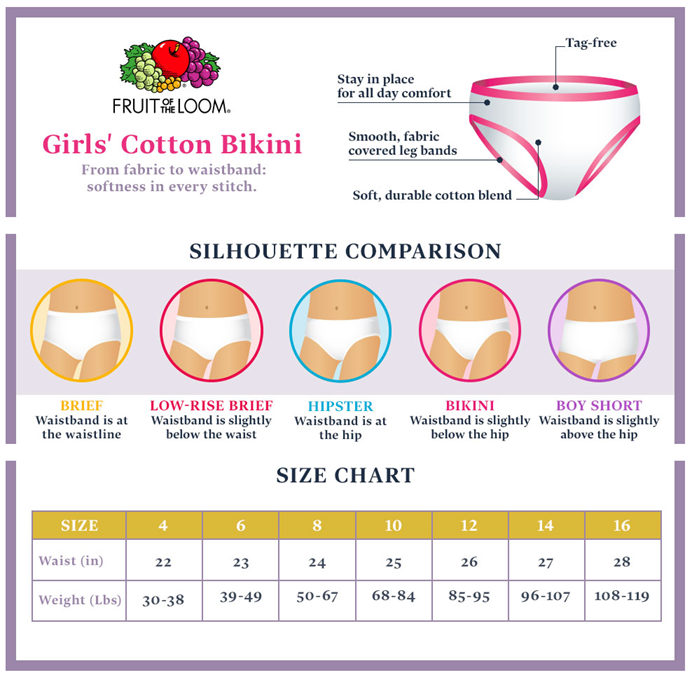 Introducing our improved cotton with extra softness, Fruit of the Loom girls' 10 pack bikini is the essential addition to her collection. This bikini is designed with breathable, 100% cotton fabric, a plush, ravel-free waistband, and soft, fabric-covered legs. The plush, ravel-free waistband is sure to hold up wash after wash and withstand her active lifestyle. This bikini has a slightly higher leg and a lower rise that offers mom-approved coverage. This assortment includes a combination of cute prints and fashionable solids. Offering a colorful way to meet her basic clothing needs, these bikinis come in a wide range of sizes making it easy to find the perfect fit for her. As always, our Fruit of the Loom girls' Panties are made tag free and with a 100% cotton liner for extra softness.