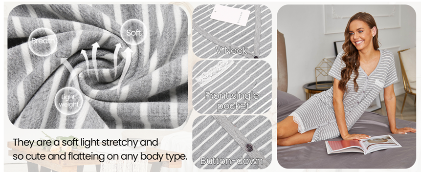 • Short-sleeve & knee-length pajama dress, feeling much freedom while you are walking. It is a great choice to wear this nightshirt while watching TV with your family or your friend.