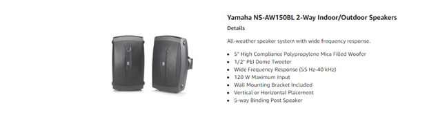 • Yamaha NS AW150 35W RMS Speaker 2 way; 1 pair of 2 way indoor/outdoor speakers