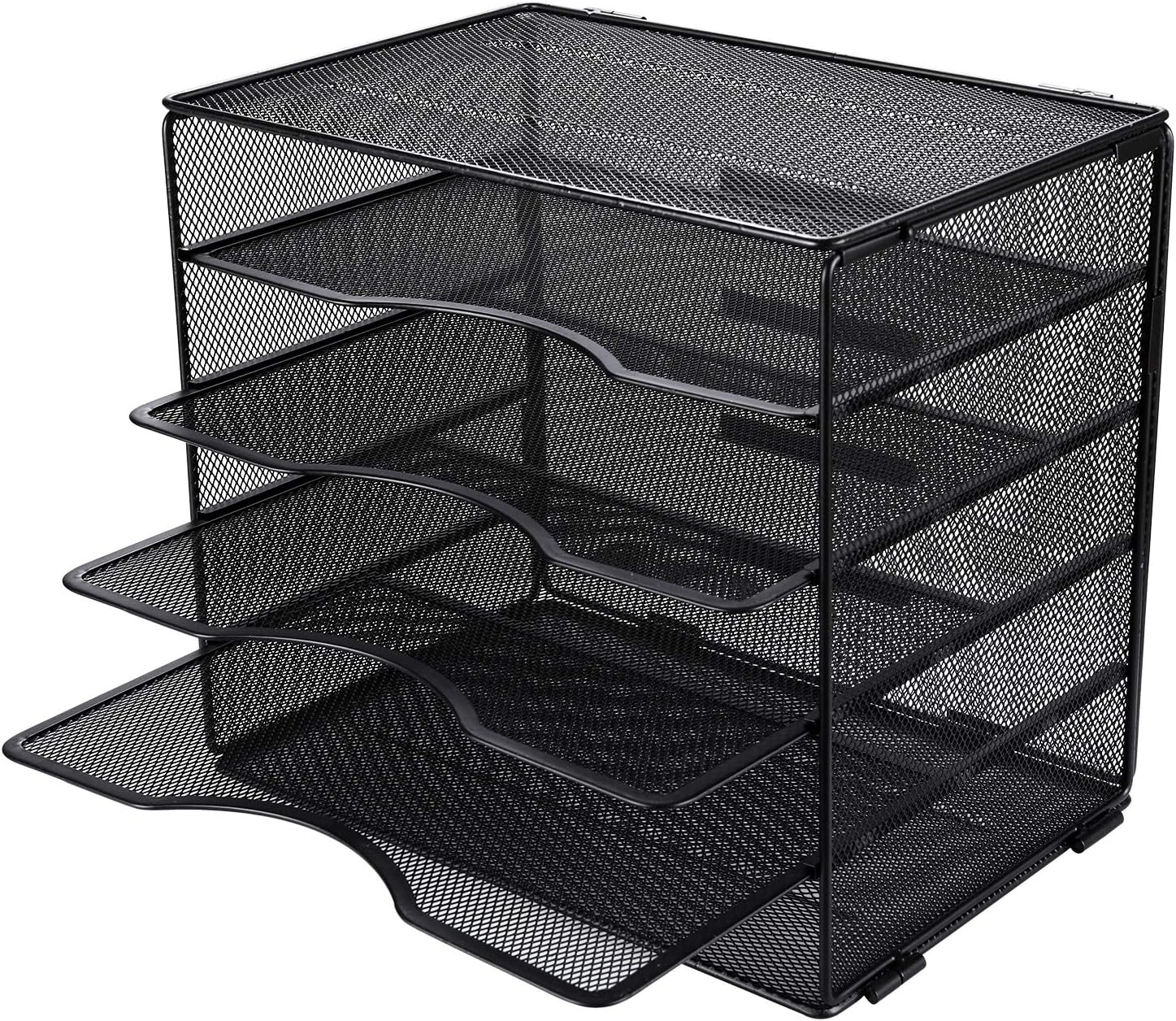 Mesh construction desk file organizer, open design lets you see inside the organizer to identify the contents of each compartment quickly,features 5 tiers of storage horizontal slots for mail, forms, catalogs, invoices, papers, bills and other supplies; compartments are designed to accommodate paper sizes up to 9 x 13 inch