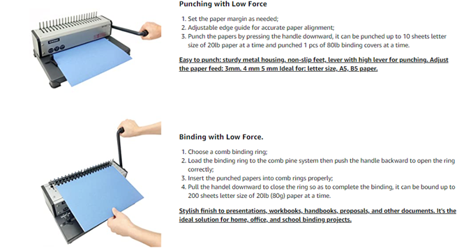 Manually punch up to 10 sheets of 20lb (80g) paper at a time. And binds up to 200 sheets (letter size) of 80 gsm (20lb) paper with a 22mm (7/8") comb ring.