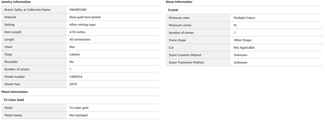 Items delivered: 1 x Swarovski Symbolic Collection Moon pendant necklace, 15 3/4 inch rose-gold tone chain and 1 1/4 x 5/8 inches pendant made of white and blue crystals, with Swarovski necklace box
