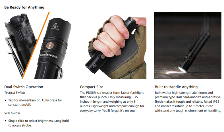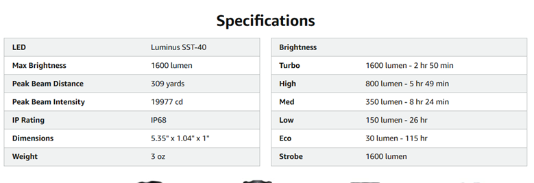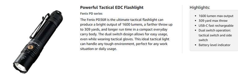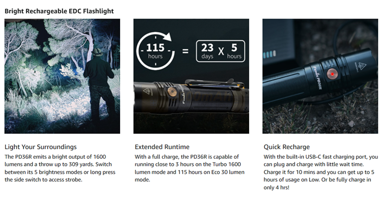 | Included Components | Holster, PD36R Rechargeable flashlight, Charging Cable, LumenTac Organizer |