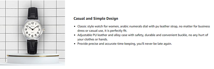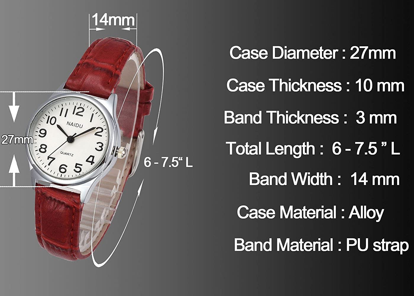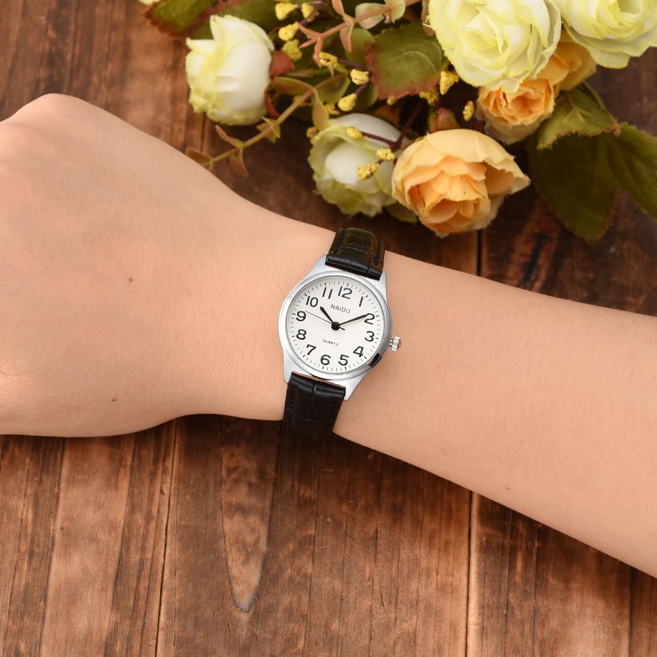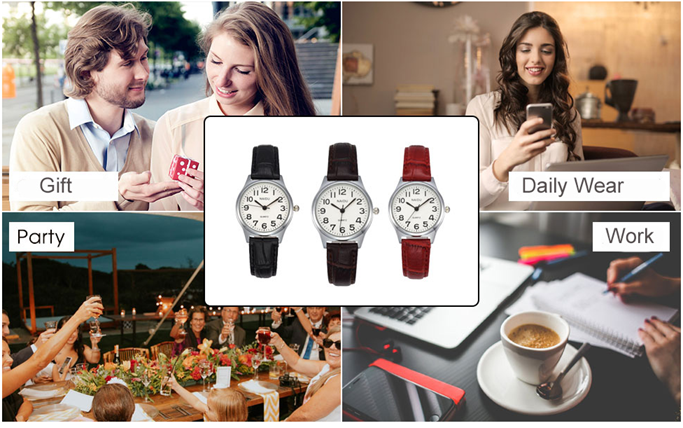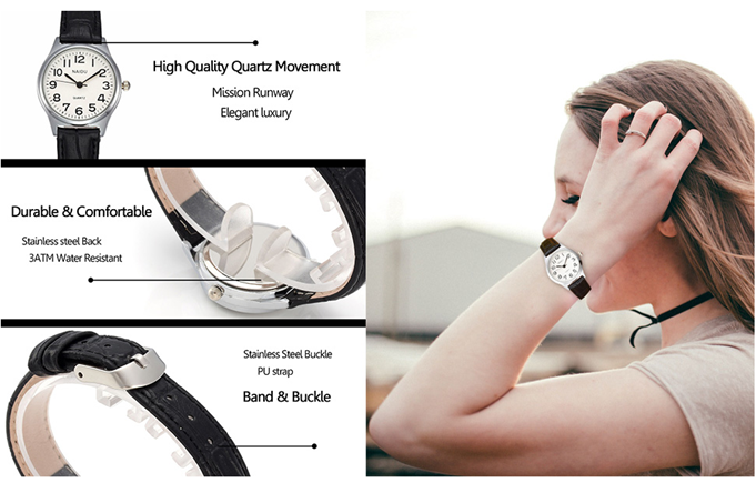• Design:This is a classic style watch for women, Arabic numerals dial with pu leather band, no matter for business dress or casual use, it is a good choice.