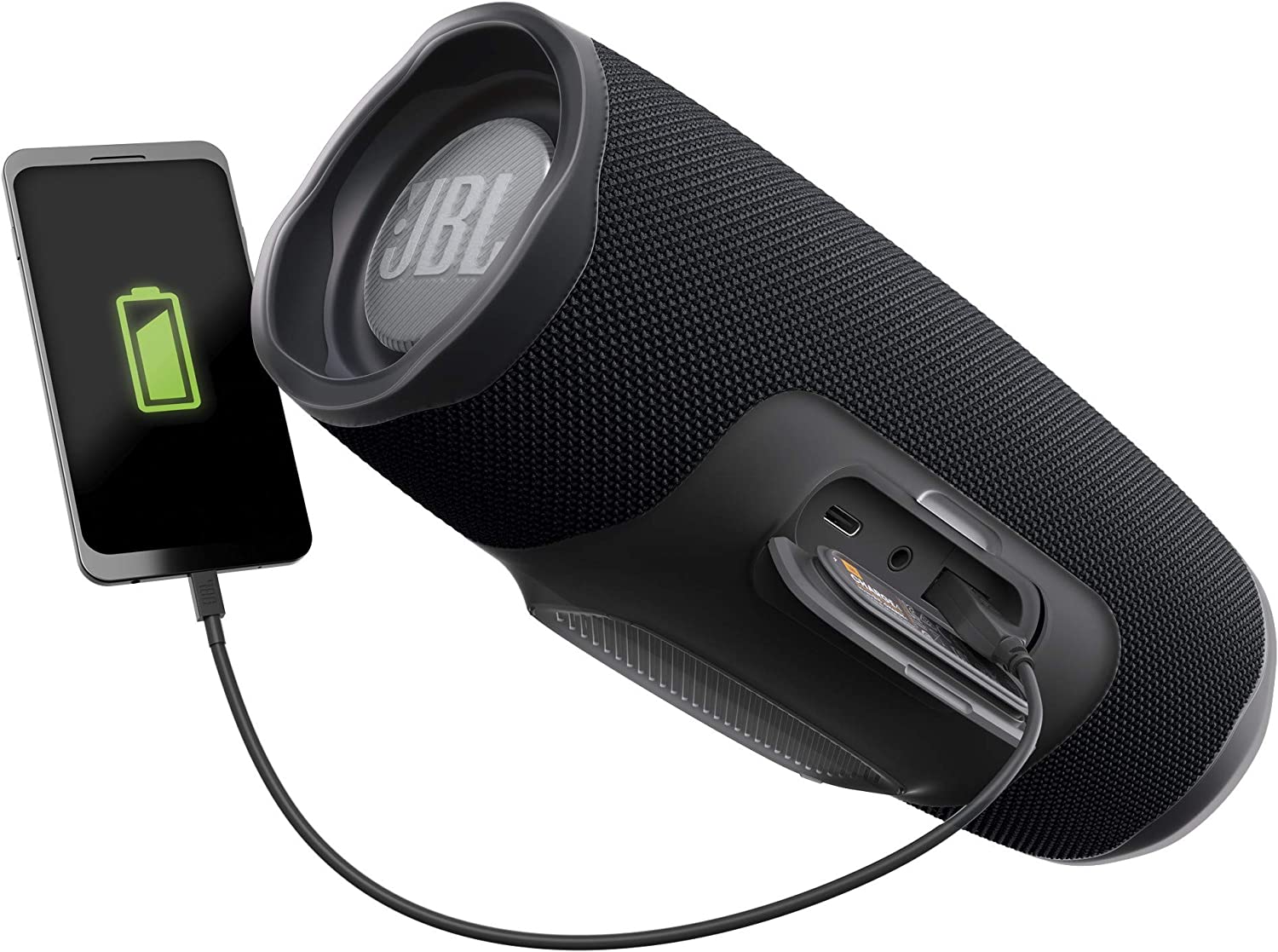 WIRELESS BLUETOOTH STREAMING: Wirelessly connect up to 2 smartphones or tablets to the speaker and take turns enjoying powerful sound. UP TO 20 HOURS OF PLAYTIME: Built-in rechargeable Li-ion 7500mAH battery supports up to 20 hours of playtime and charges your device via USB port IPX7 WATERPROOF: Take Charge 4 to the beach or the pool without worrying about spills or even submersion in water JBLCONNECT plus Amplify your listening experience to epic levels and rock the party perfectly by wirelessly connecting more than 100 JBL Connect plus enabled speakers. DURABLE FABRIC AND RUGGED MATERIAL: The durable fabric material and rugged rubber housing allows your speaker to outlast all of your adventures JBLBASS RADIATOR: Dual passive radiators deliver powerful, ear catching JBL sound that resonates loud and clear. INCLUDED: JBL Charge 4 speaker, USB-C cable, Quick Start Guide. Item Dimensions 8.7 x 3.7 x 3.7 ( in) PLEASE NOTE: The Charge 4 does not come with a USB wall, power adaptor
