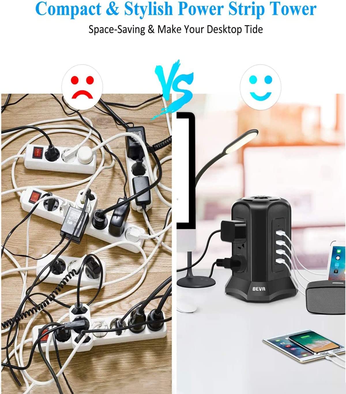 【Long Power Cord & Space-saving】- The power strip surge protector is equipped with 10 ft long heavy duty pure copper power cord to ensure its high conductivity, high efficiency, high heat dissipation & more safety. 4 sides of outlets and vertical tower-shaped design will save much space and clean bulky cords in your home or working area, making your desktop look tidy and clean.