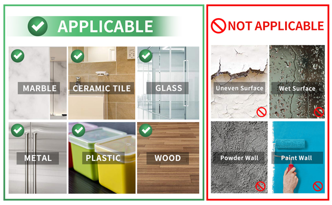 | Surface Recommendation | Wall, Tile, Glass, Metal, Plastic, Ceramic, Marble, Stainless Steel, Leather, Paper, Wood, Brick and More. |