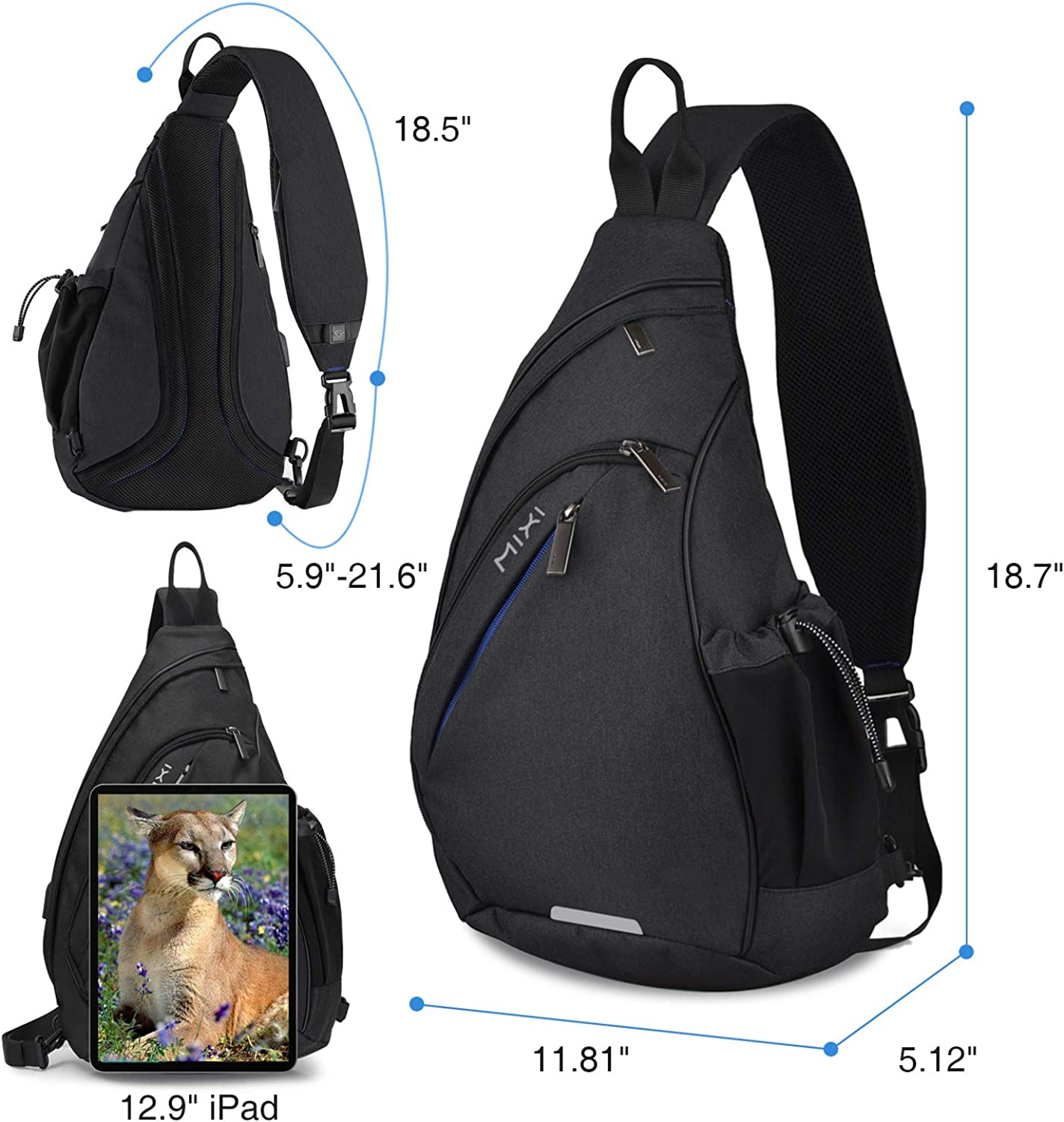 ANTI-THEFT SLING BAG - 11.81x5.11x18.7’’(L x W x H) with hidden anti-theft pocket, external mesh side pocket, roomy main pocket fits 12.9'' Ipad Pro and include several multifunctional pockets all your essentials.