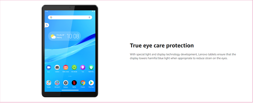 Running on the Android™ 9 Pie™ operating system, the Lenovo Tab M8 is quick and adaptive, letting you enjoy your favorite apps with ease. This Android tablet also includes special light and display technology for true eye care protection, lowering harmful blue light when appropriate to reduce strain on the eyes. Slim and lightweight, the Tab M8 is the tablet device that everyone wants to have.