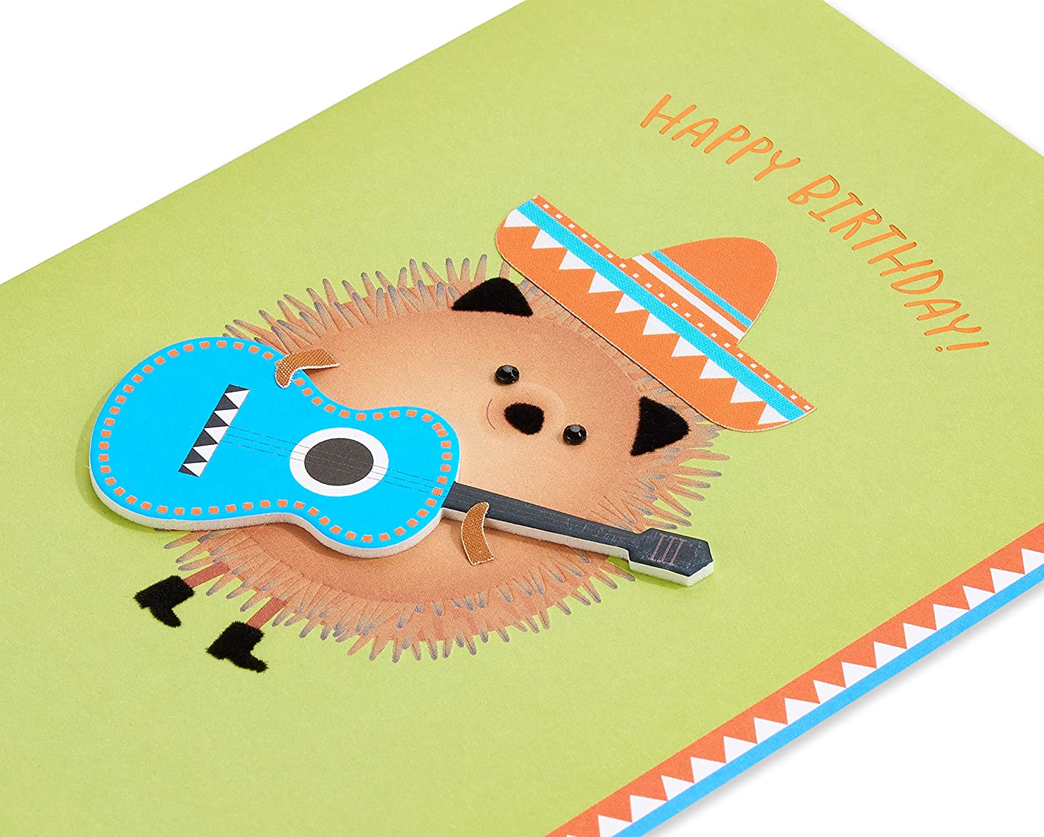 Guitar Hedgehog is here to help you wish a kid in your life their best birthday ever Premium handmade card is only from Papyrus. Fun and festive hedgehog is decked out with layered-paper guitar and sombrero and ready to sing Happy Birthday Metallic foil accents add sparkle to the celebration. The wish inside will get the birthday kid ready for a totally fun and amazing day Bright blue envelope with light green lining and unique Papyrus gold seal included. Extra postage required.