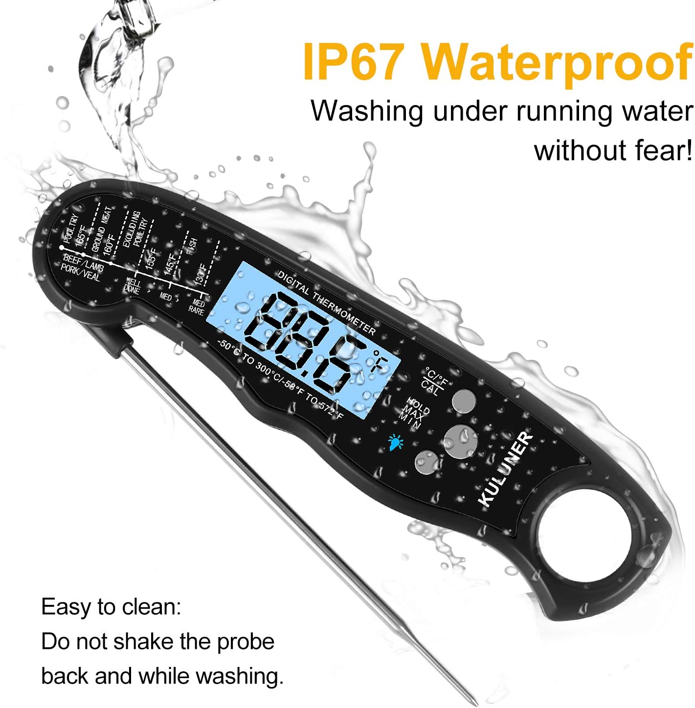 【WATERPROOF & PRACTICALITY】Every gap in the thermometer has a waterproof treatment, IP67 rated waterproof, the KULUNER meat thermometer can be washed under running water without fear! With a strong ABS plastic body, it can withstand accidental drops or other impact accidents. With a waterproof and strong break resistant body, the KULUNER food thermometer is highly durable and resilient. Great for grilling outdoors.