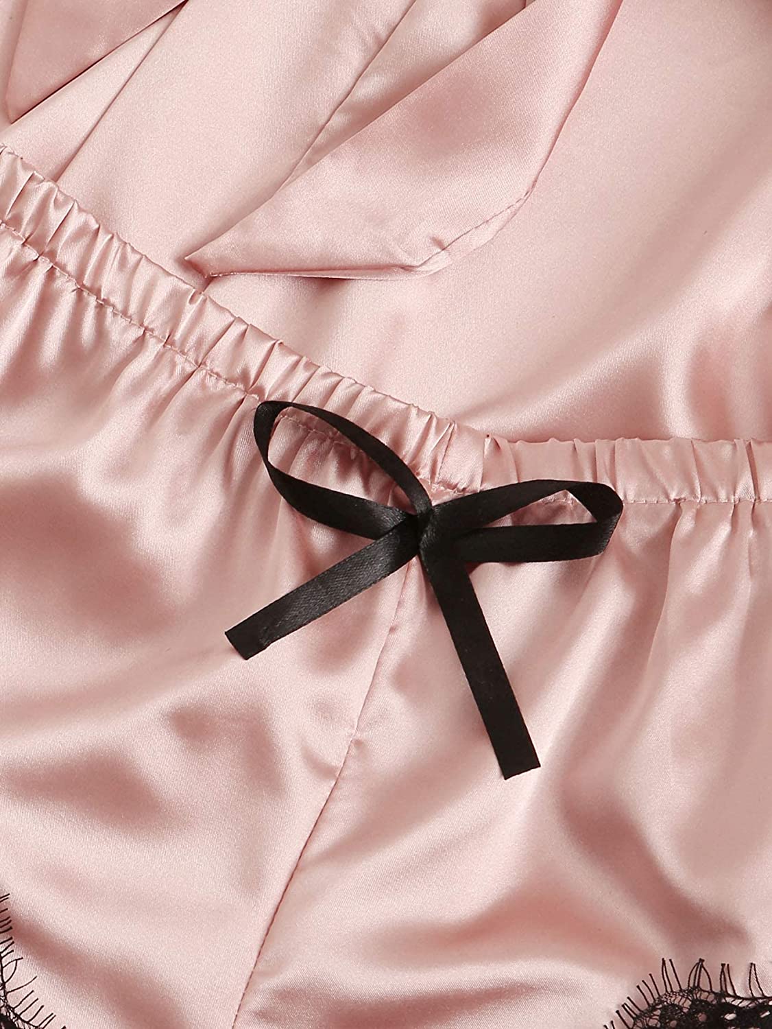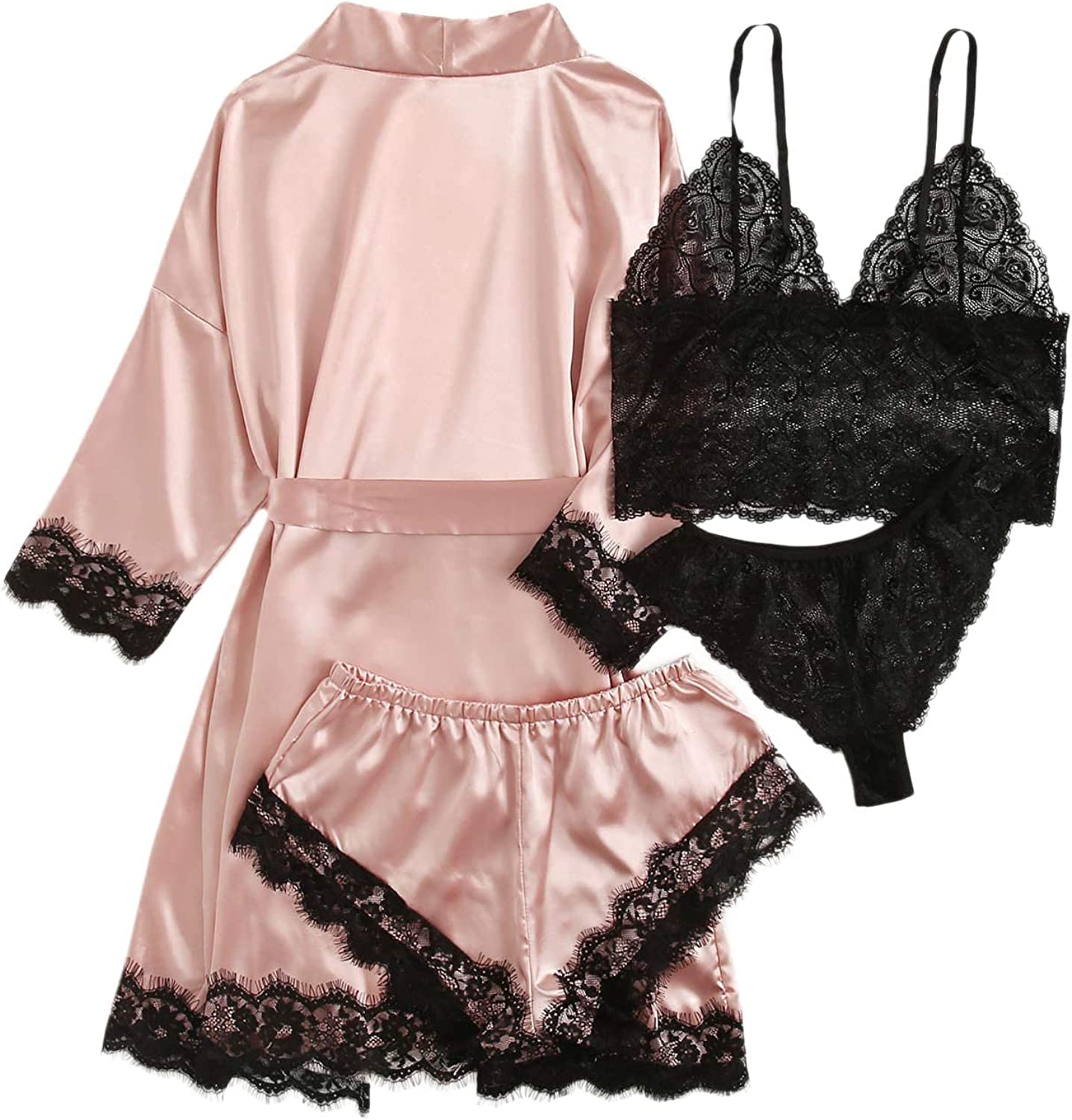 SOLY HUX Women's Satin Pajama Set 4pcs Floral Lace Trim Cami Lingerie Sleepwear with Robe