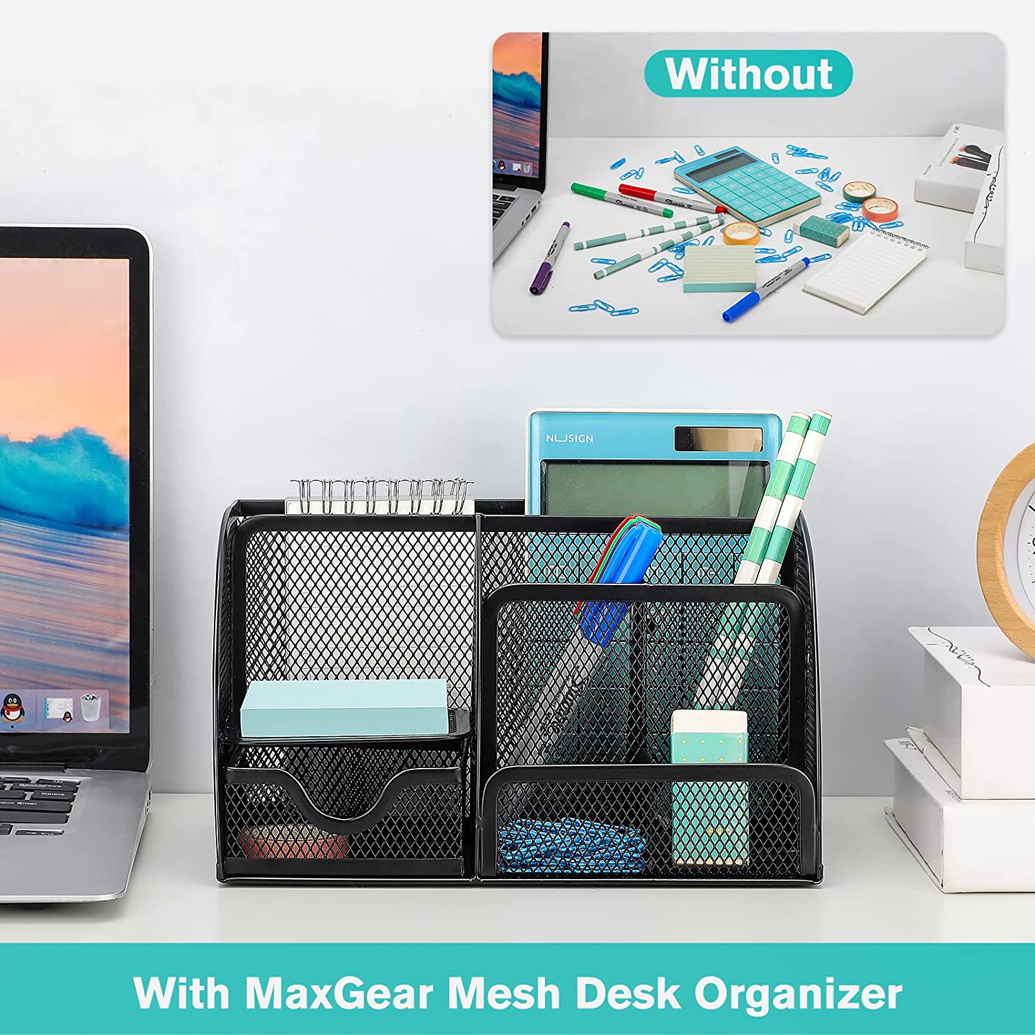 MaxGear Mesh Desk Organizer Office Desktop Organizer with Drawer, Metal Stationary Organizer Black Desk Caddy, 6 Compartments, 8.7 x 5.5 x 5 inch, 1 Pack